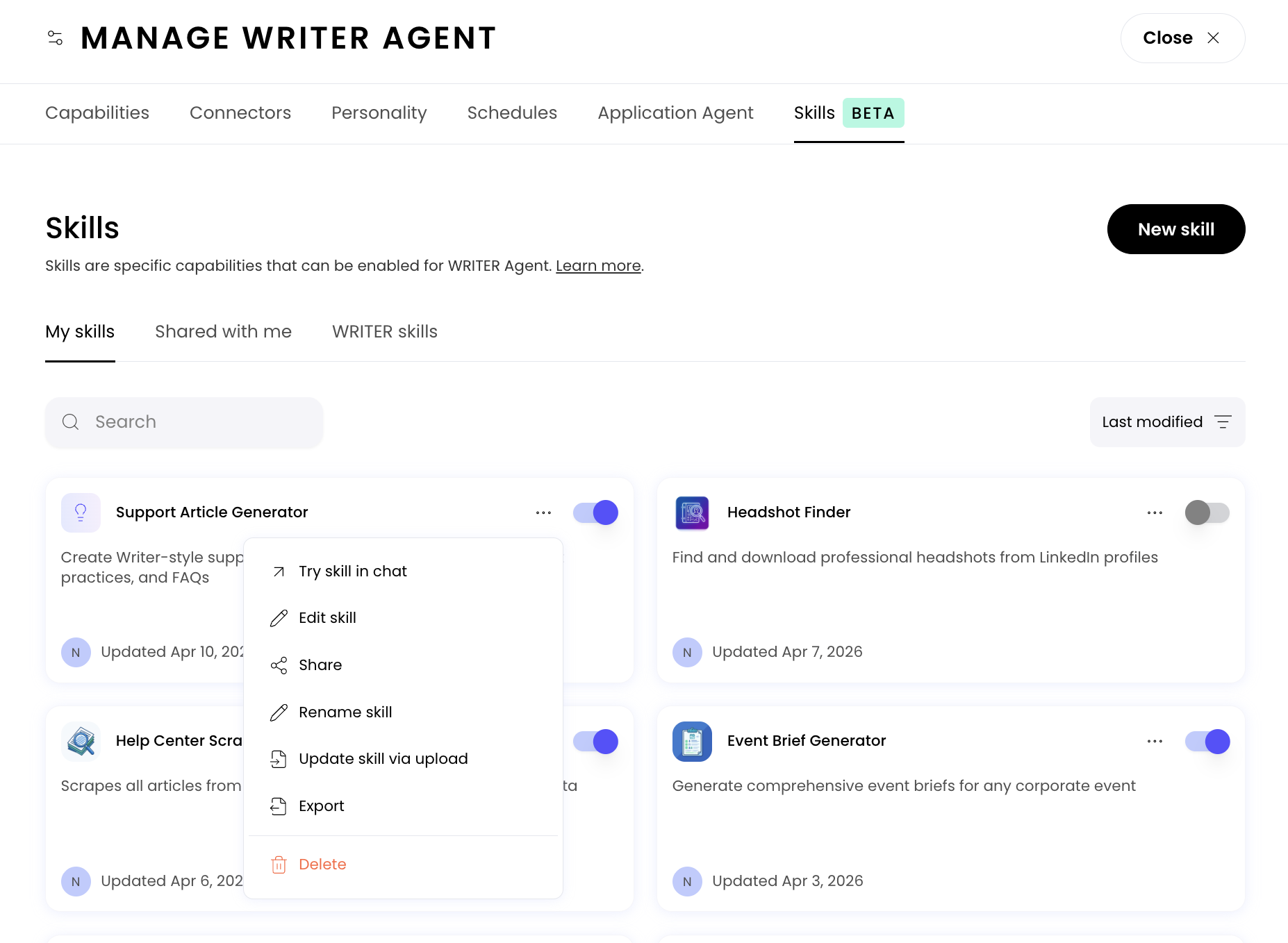 - Found in Manage WRITER Agent > Skills > WRITER skills