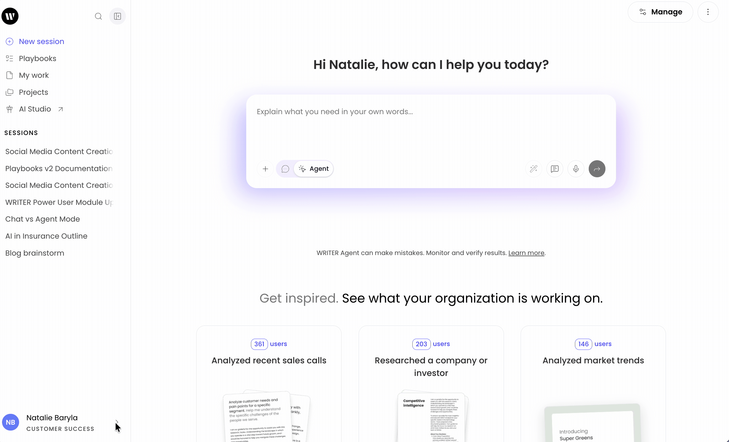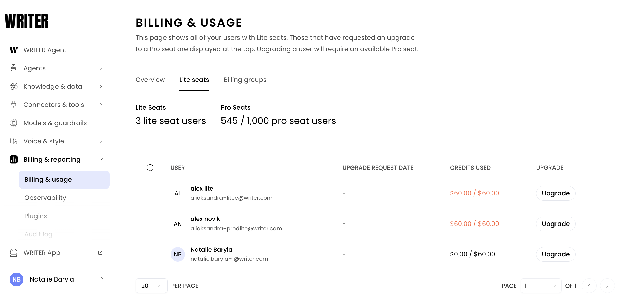 Once a Lite user has used their monthly balance, they won’t be able to use WRITER Agent, custom agents, or playbooks again until either their monthly balance refreshes or an admin upgrades them to a Pro Seat.