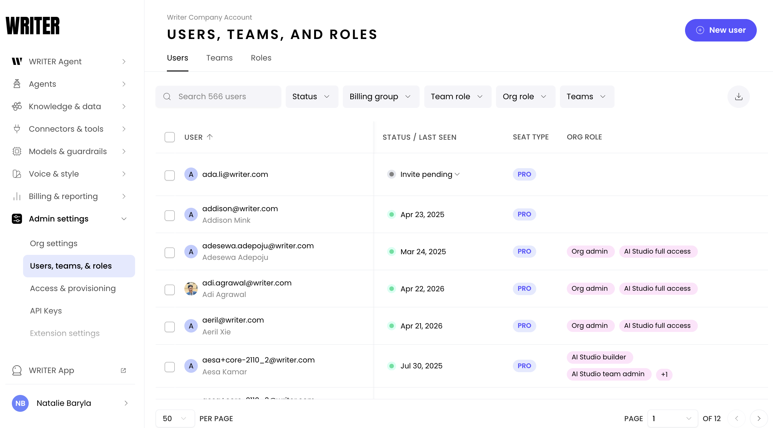 Navigate to to Your name > Org settings > Admin settings > Users, teams, & roles. Select + New user in the top-right corner.