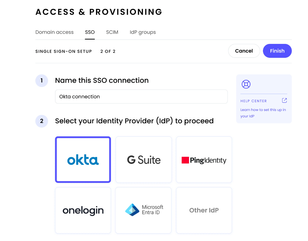 Once your SSO configuration is complete, you can provision users directly from your IdP by setting up a SCIM (System for Cross-domain Identity Management) connection. Learn more in our Help Center article Setting up SCIM provisioning.