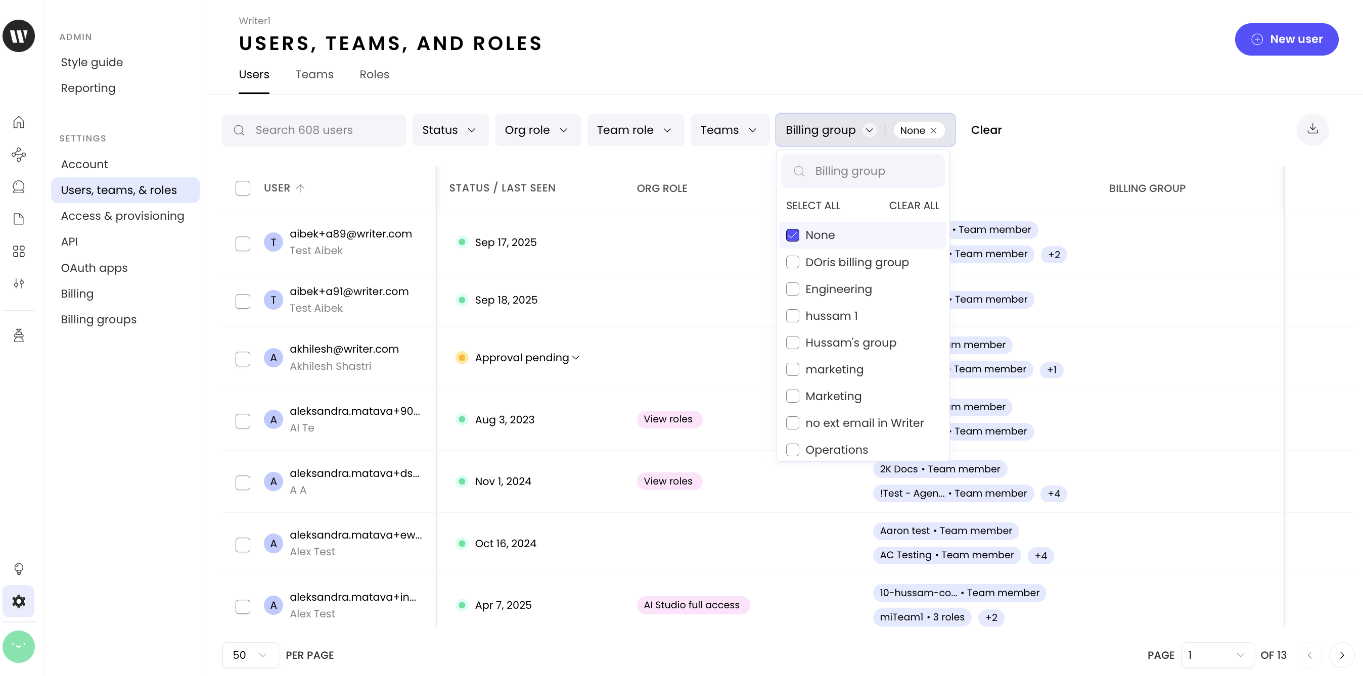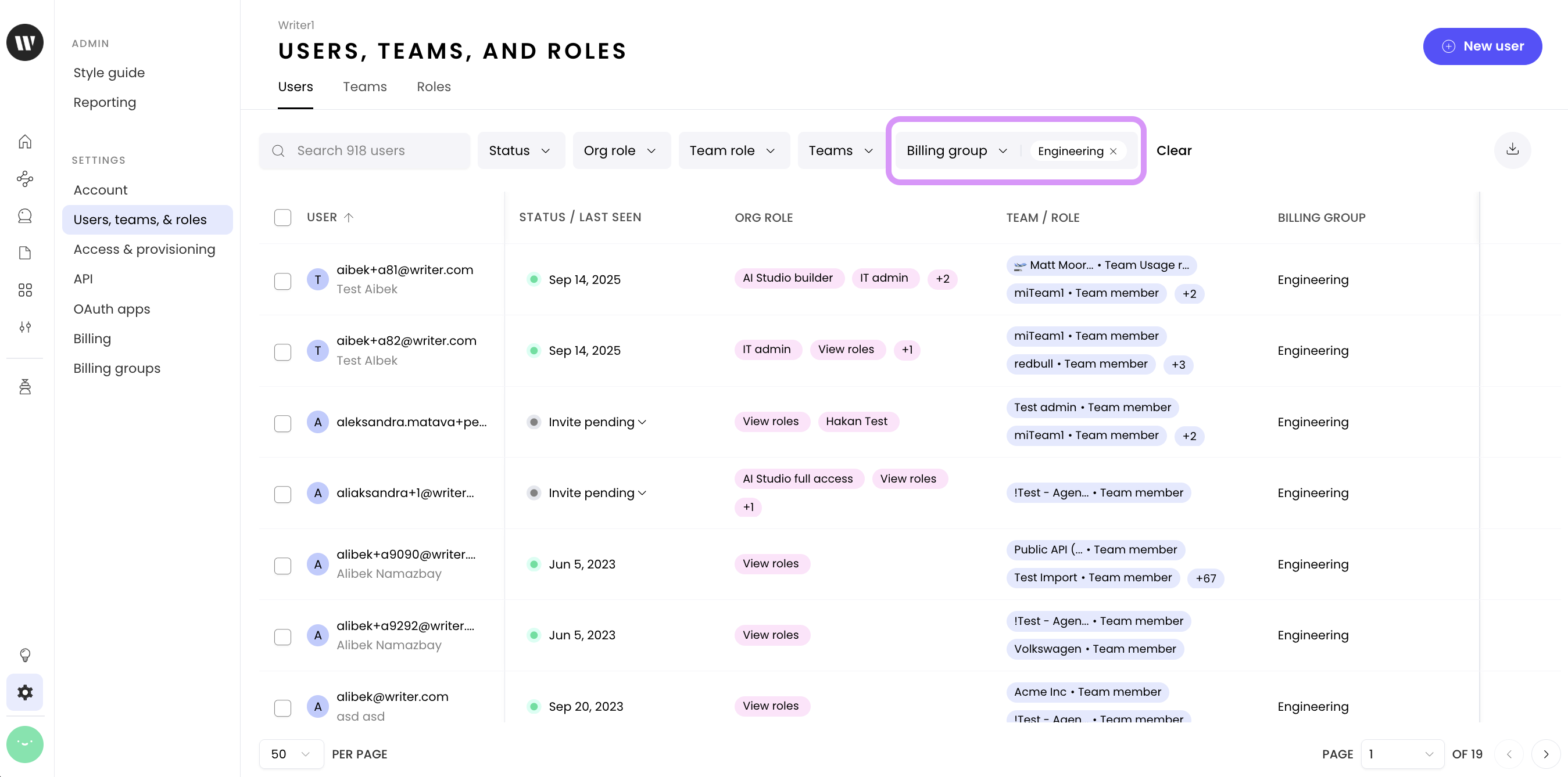 Billing groups allow WRITER org admins to map users to internal budgets. Since each WRITER user can be assigned to only one billing group, org admins can track the number of licenses used by each cost center.