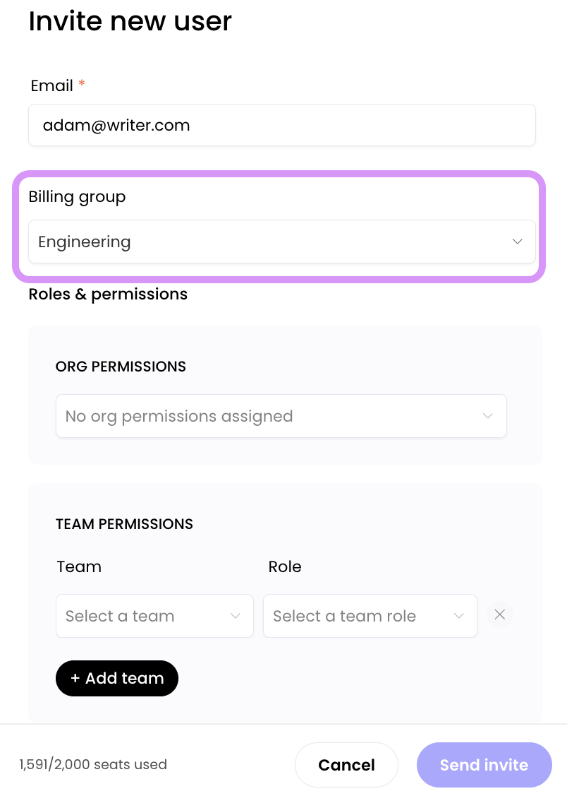 You can assign new users to a billing group as you invite them to your WRITER account. Under Billing group, you'll be able to assign the group.