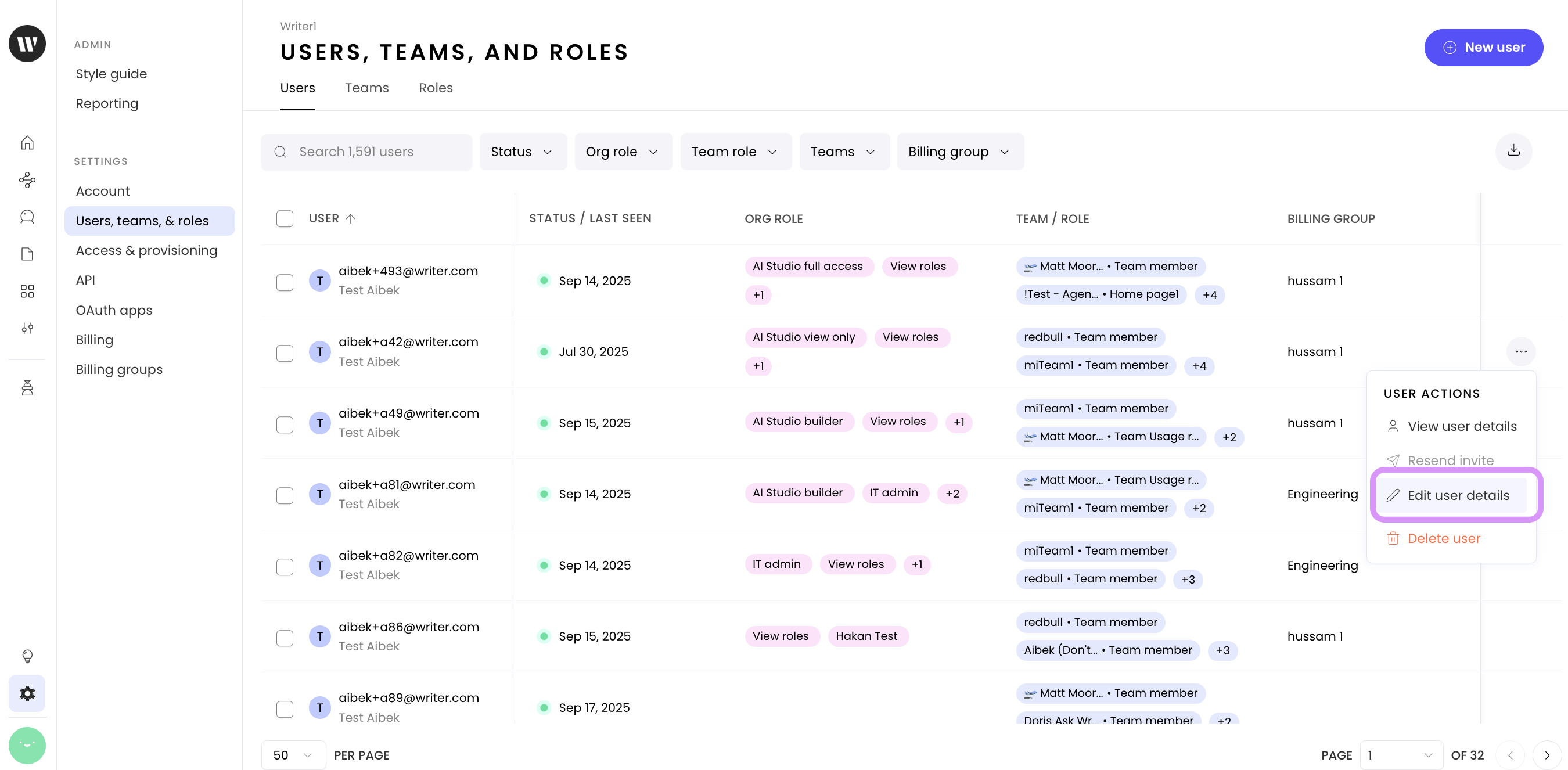 To assign an existing user to a billing group via the Users page, select the ••• menu on the right side and select Edit user details.