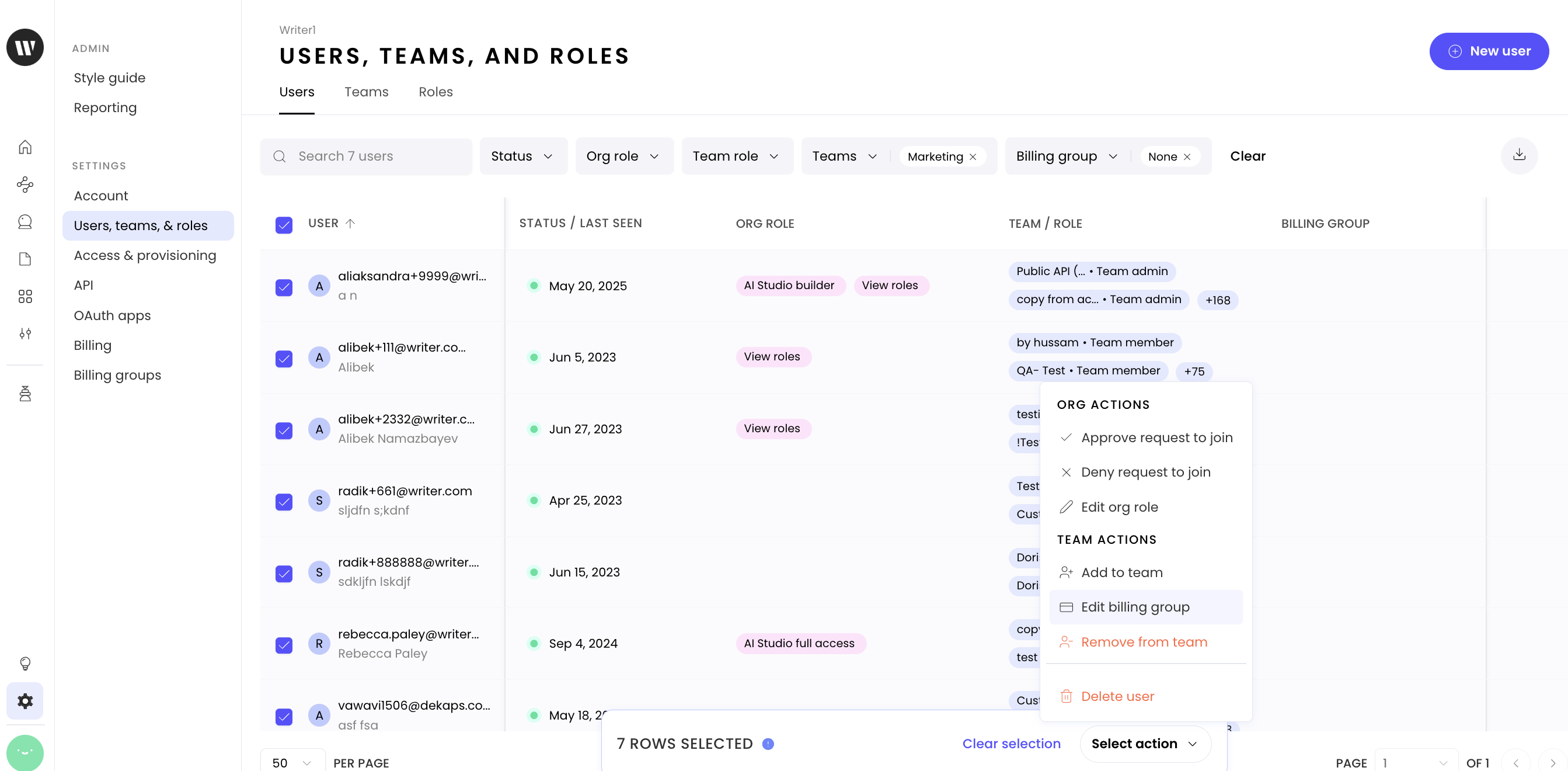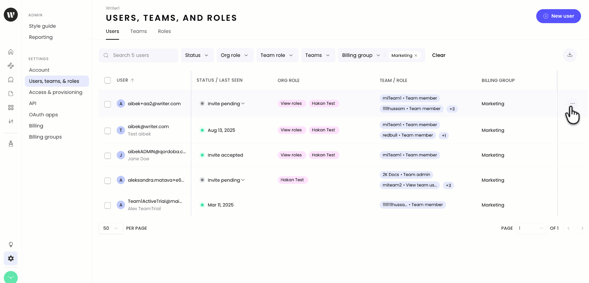 - User email - This must correspond with an existing WRITER user. See above for instructions on assigning new users to billing groups at the moment of invitation.