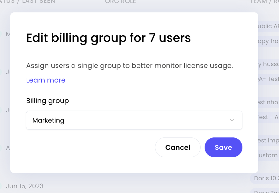 Select the user count next to a billing group. You will be taken to the Users, teams, and roles page, with a filter applied to reveal the users associated with that billing group:
