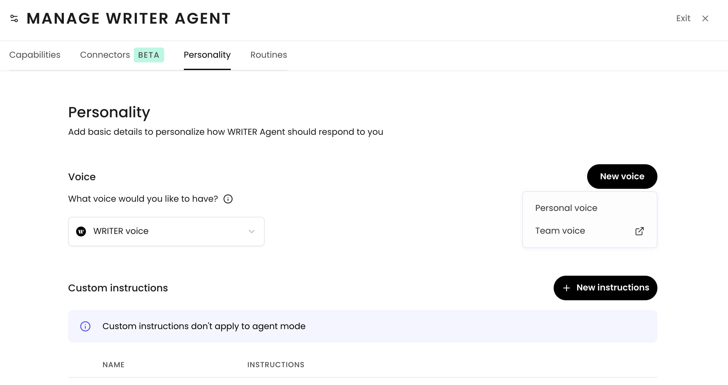 When using any out-of-the-box agent, you’ll have the option to select a voice from a dropdown menu. You also have the option to select the “WRITER voice” which uses neutral business language.