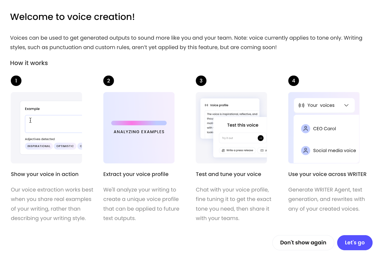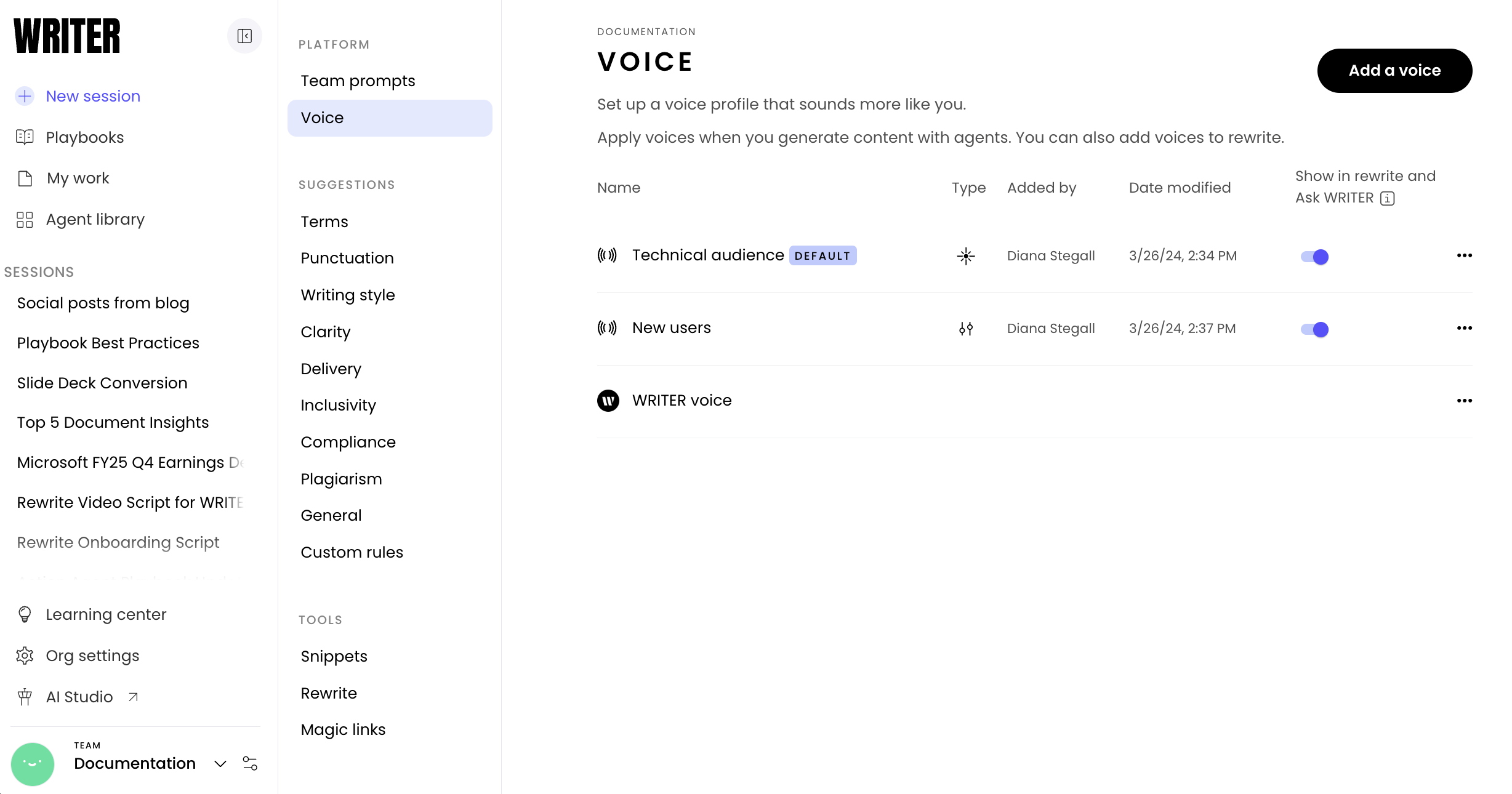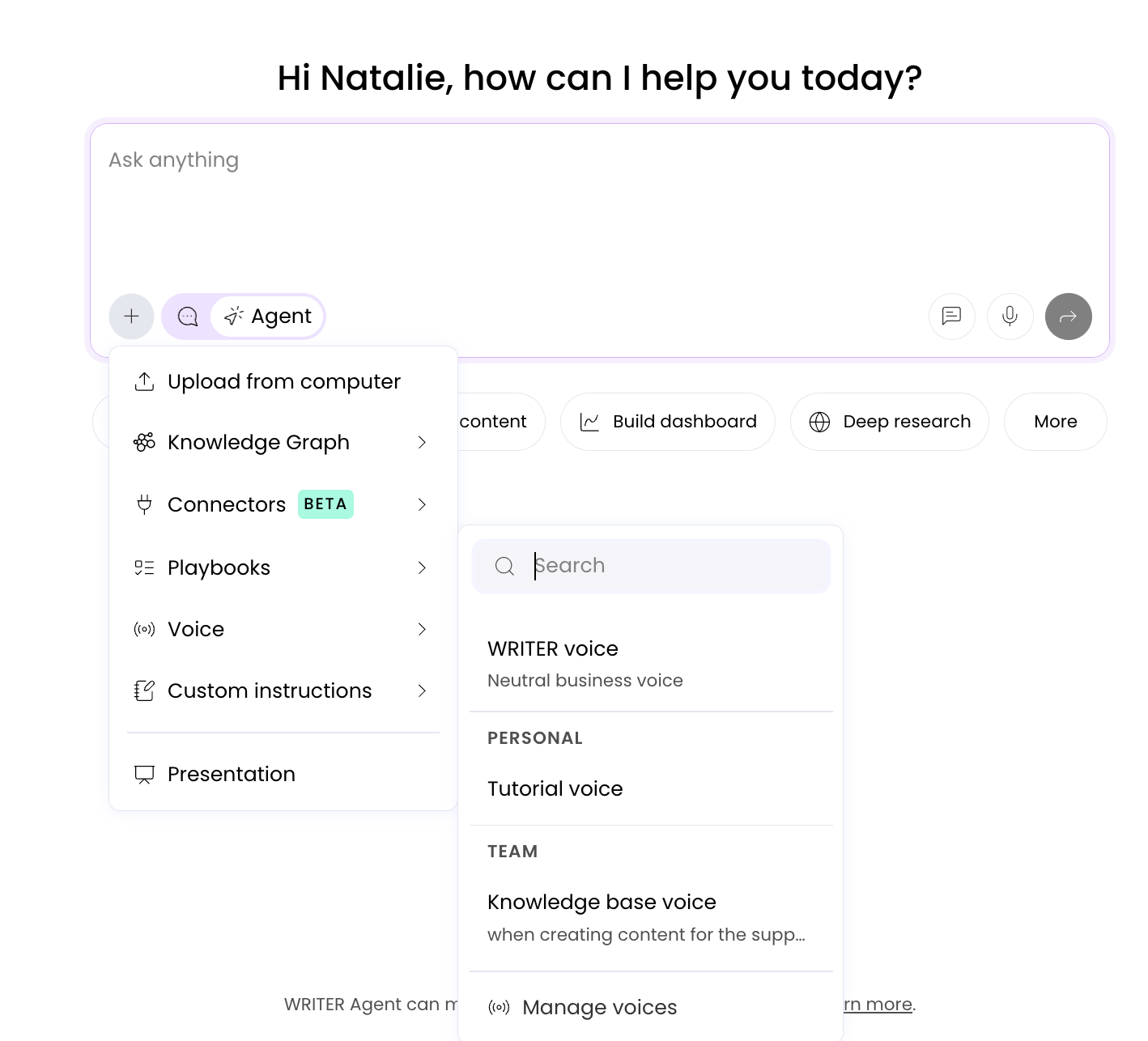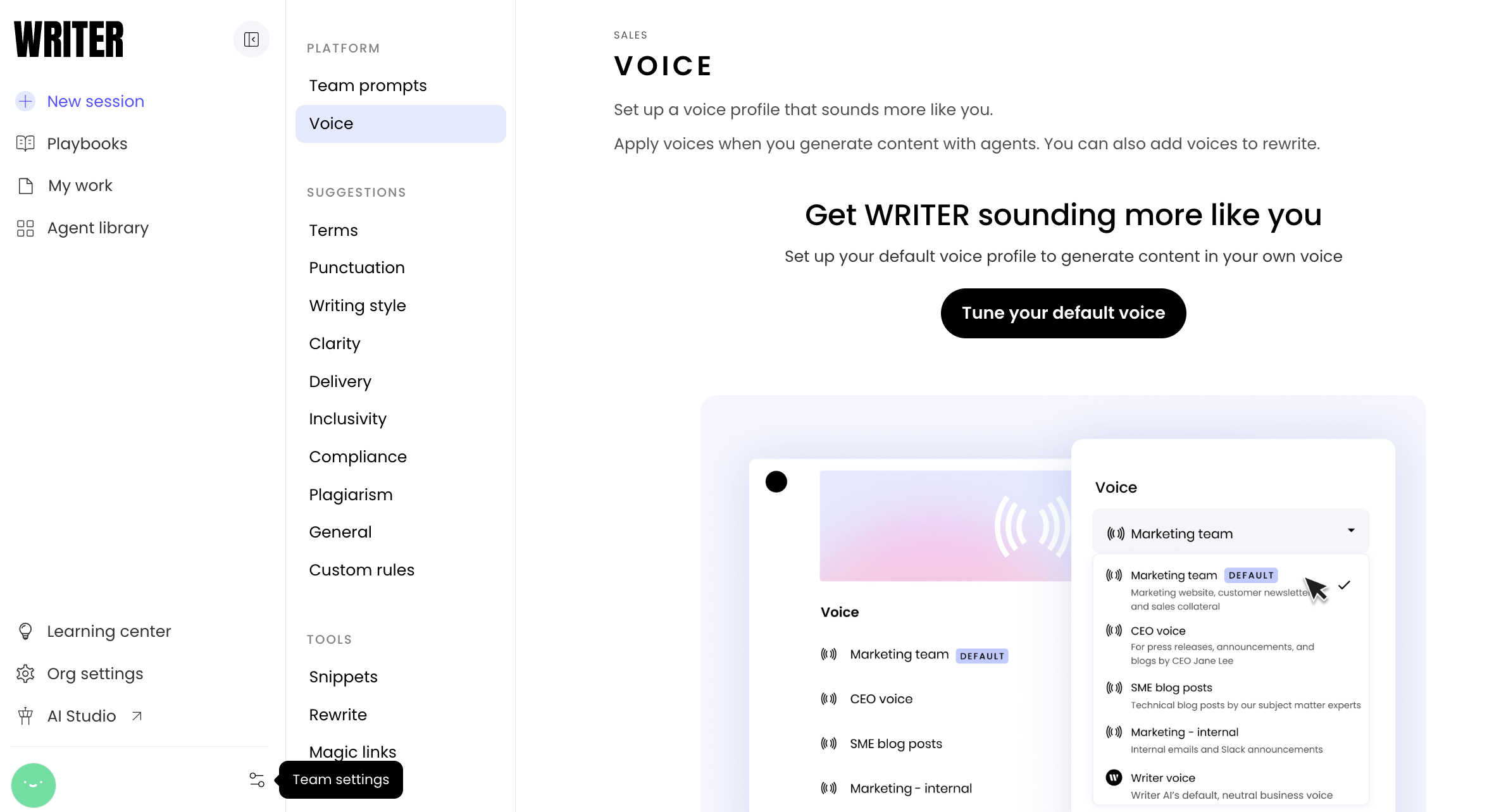 - Team members can use voice profiles to generate content and can create their own custom voice within WRITER Agent.