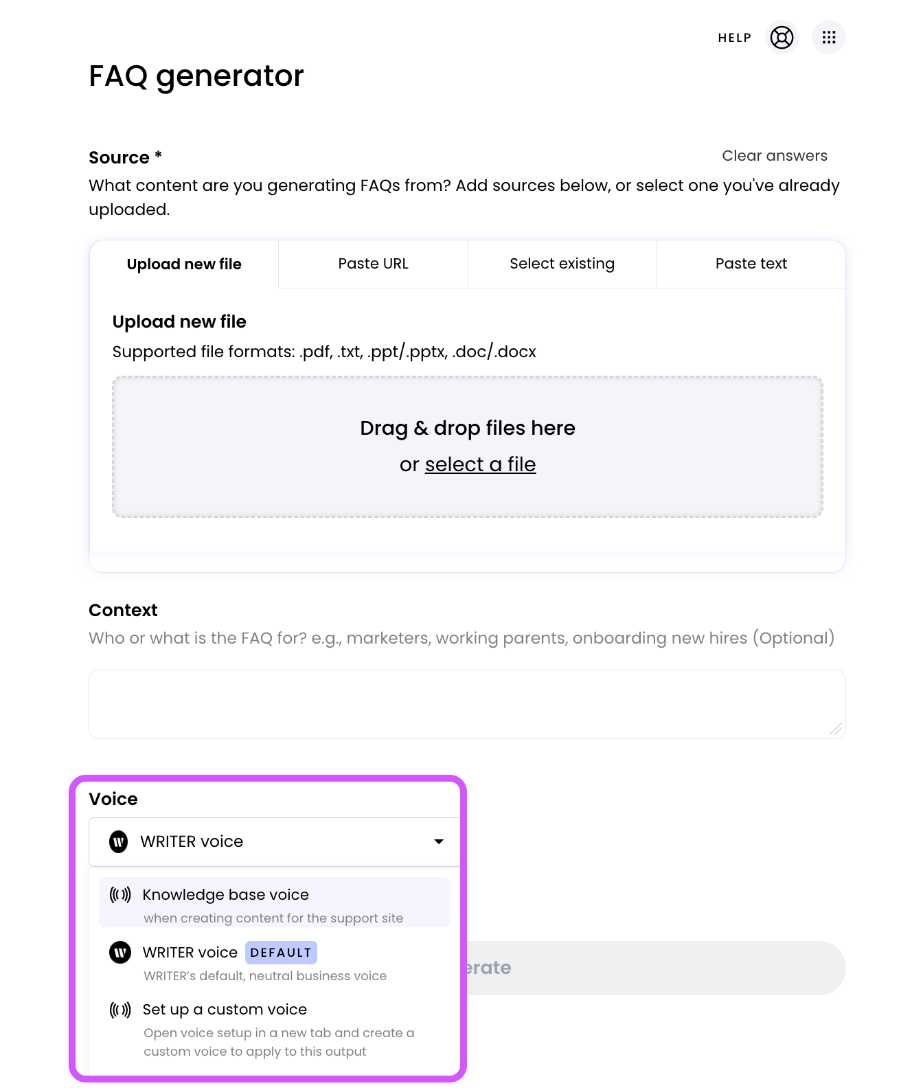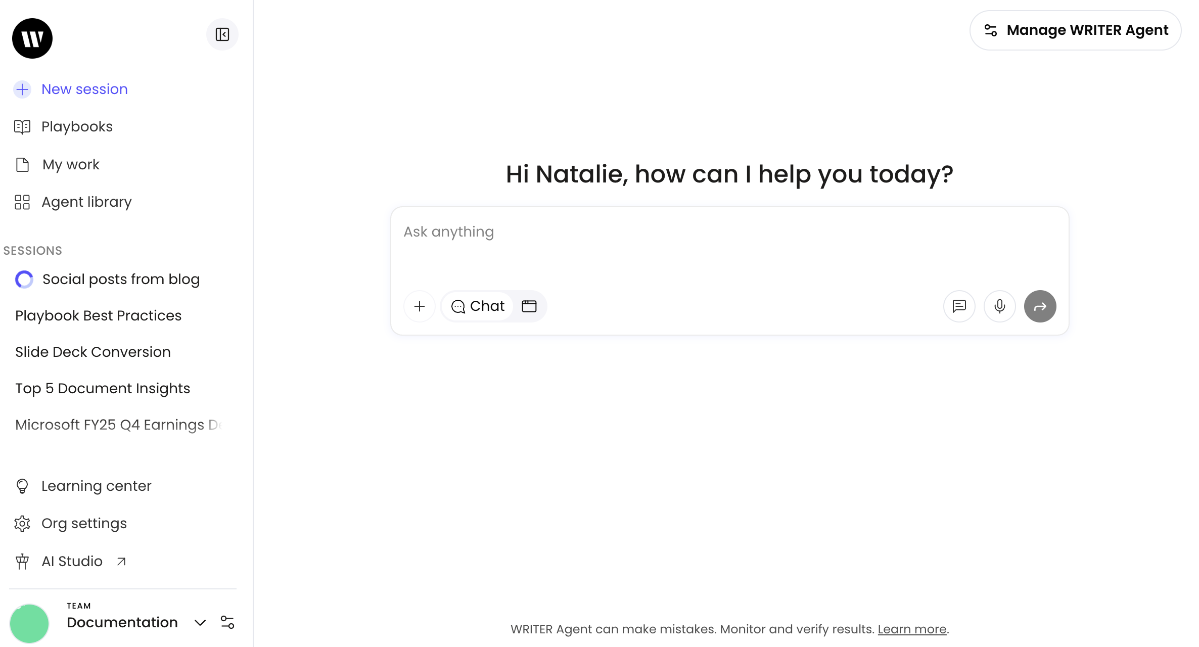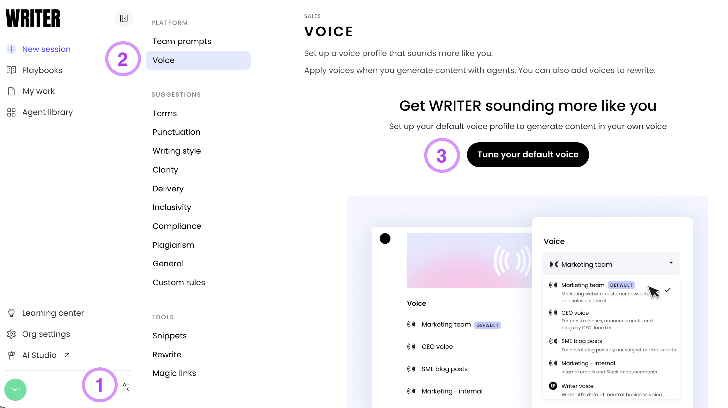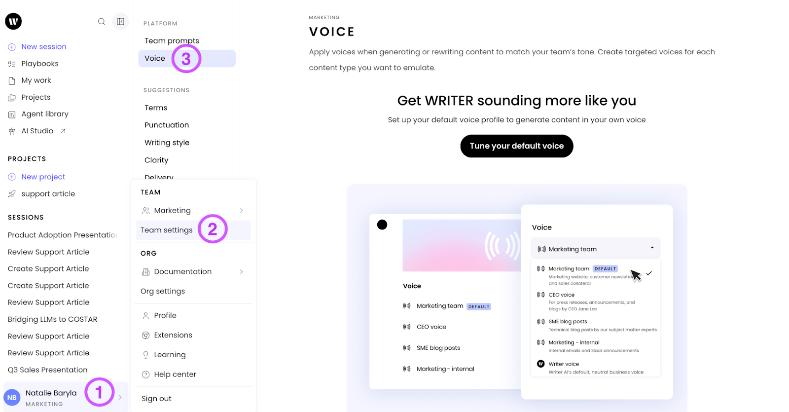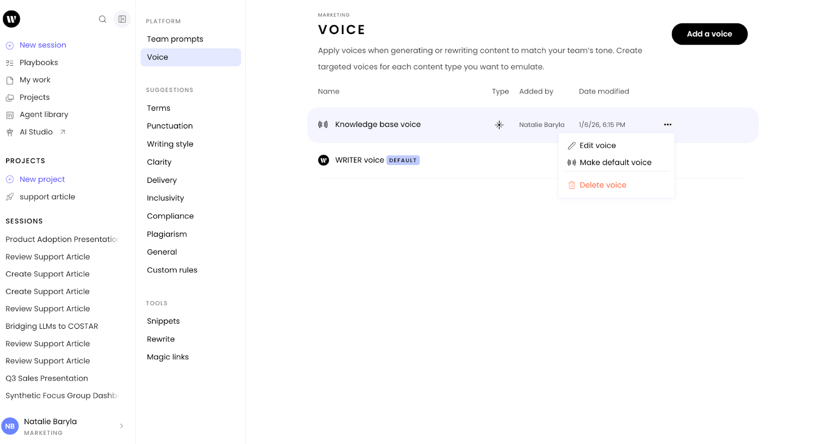 - Team members can use voice profiles to generate content and can create their own custom voice within WRITER Agent.