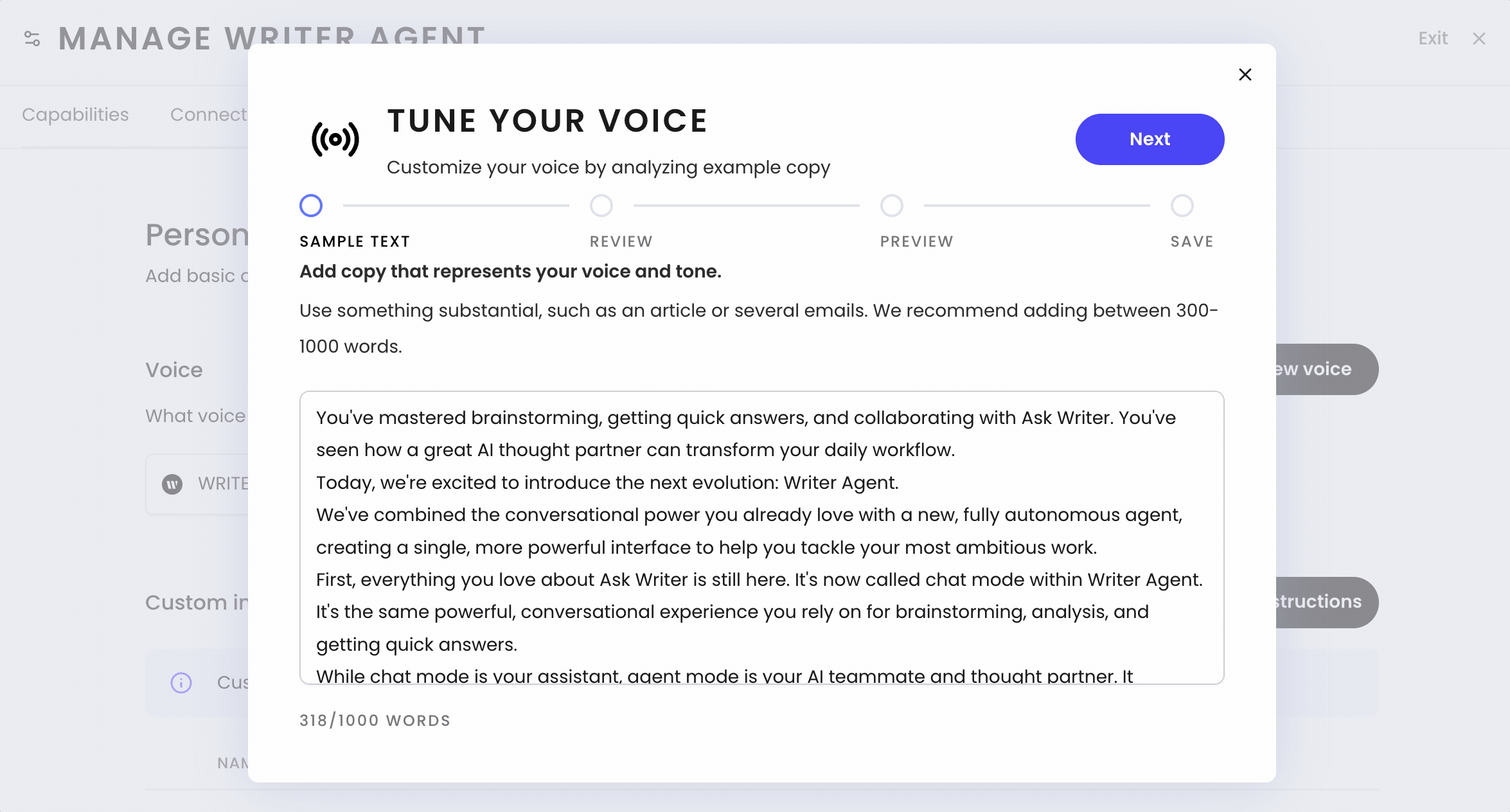 Paste 300 to 1,000 words of your best sounding work to have WRITER analyze the style and tone of your work. The voice module will take you through steps to review, preview, and save your personal voice. You can then apply this custom voice to each WRITER Agent session or playbook of your choice. Learn more about using WRITER Agent here.