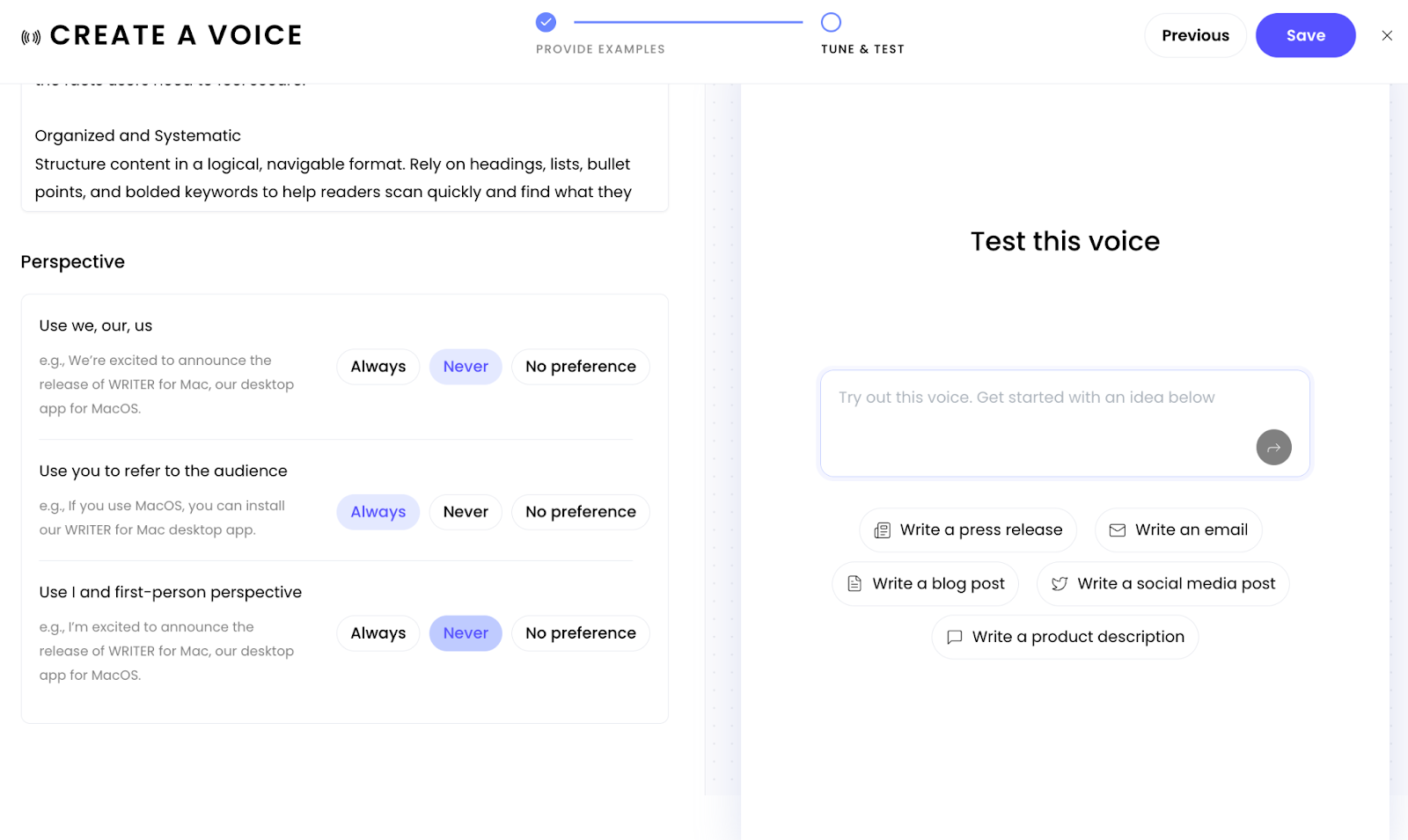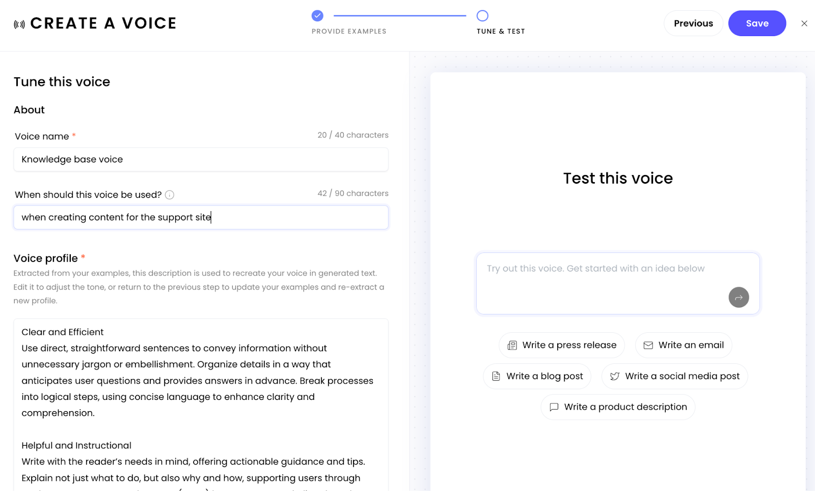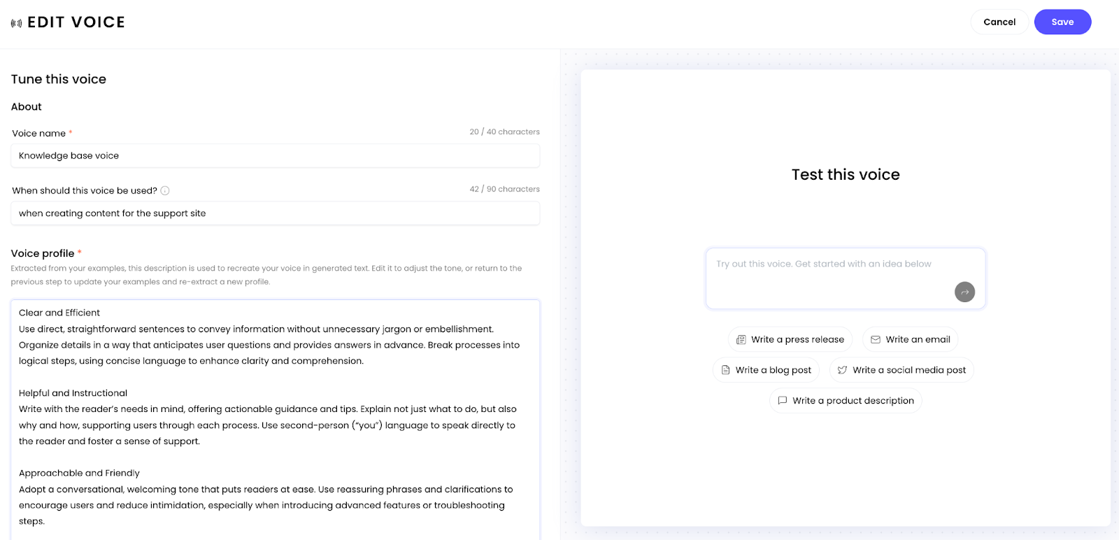 đź’ˇ Tip: Test your voice on different content formats that match your intended use case. If you're creating a voice for blog posts, test it on blog-style content. If it's for emails, test it with email content. This ensures the voice performs well for your specific needs.
