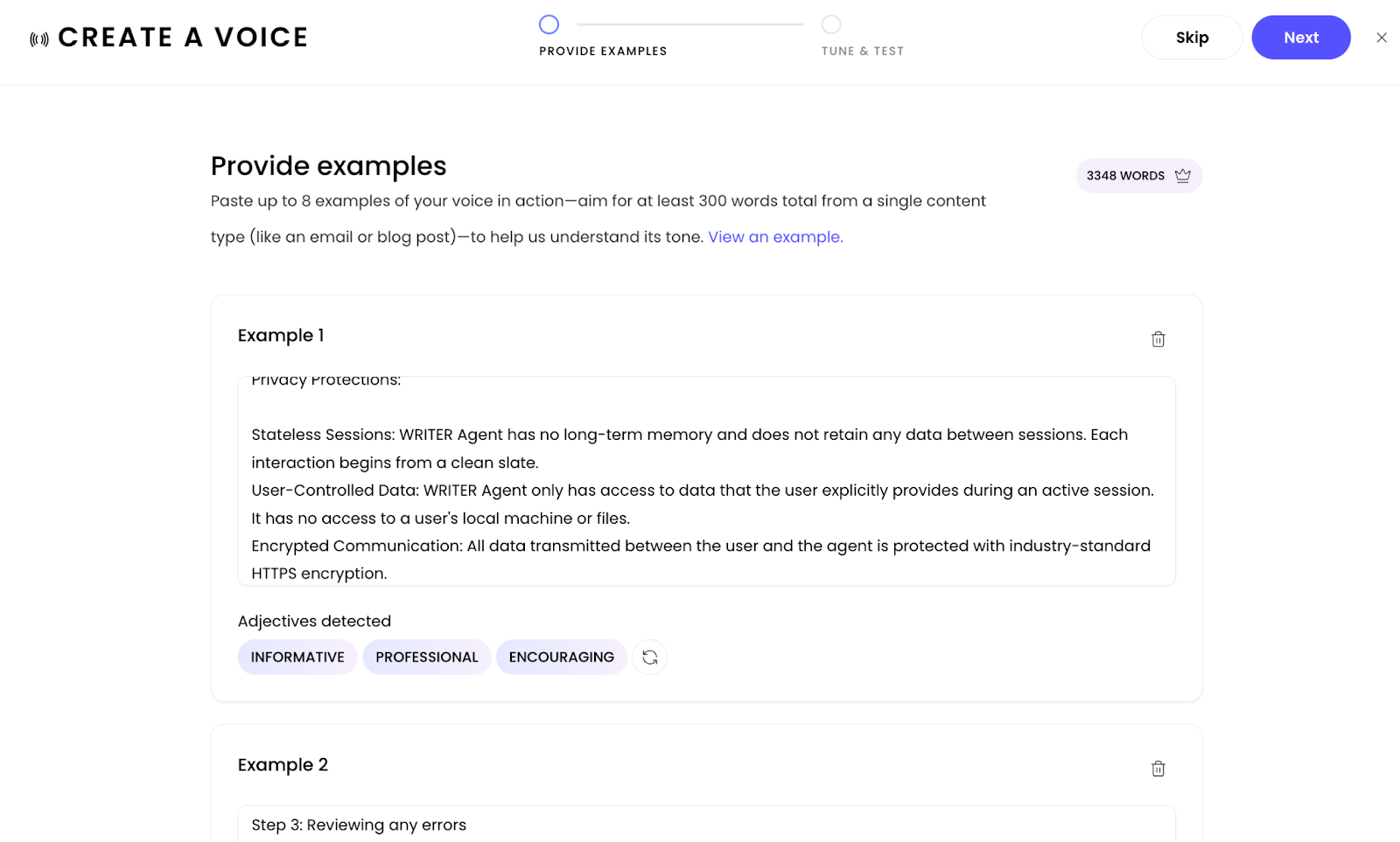 The more representative examples you provide, the better WRITER can understand and recreate your voice. Each text box can include multiple examples.