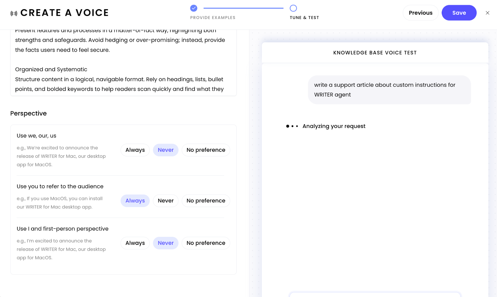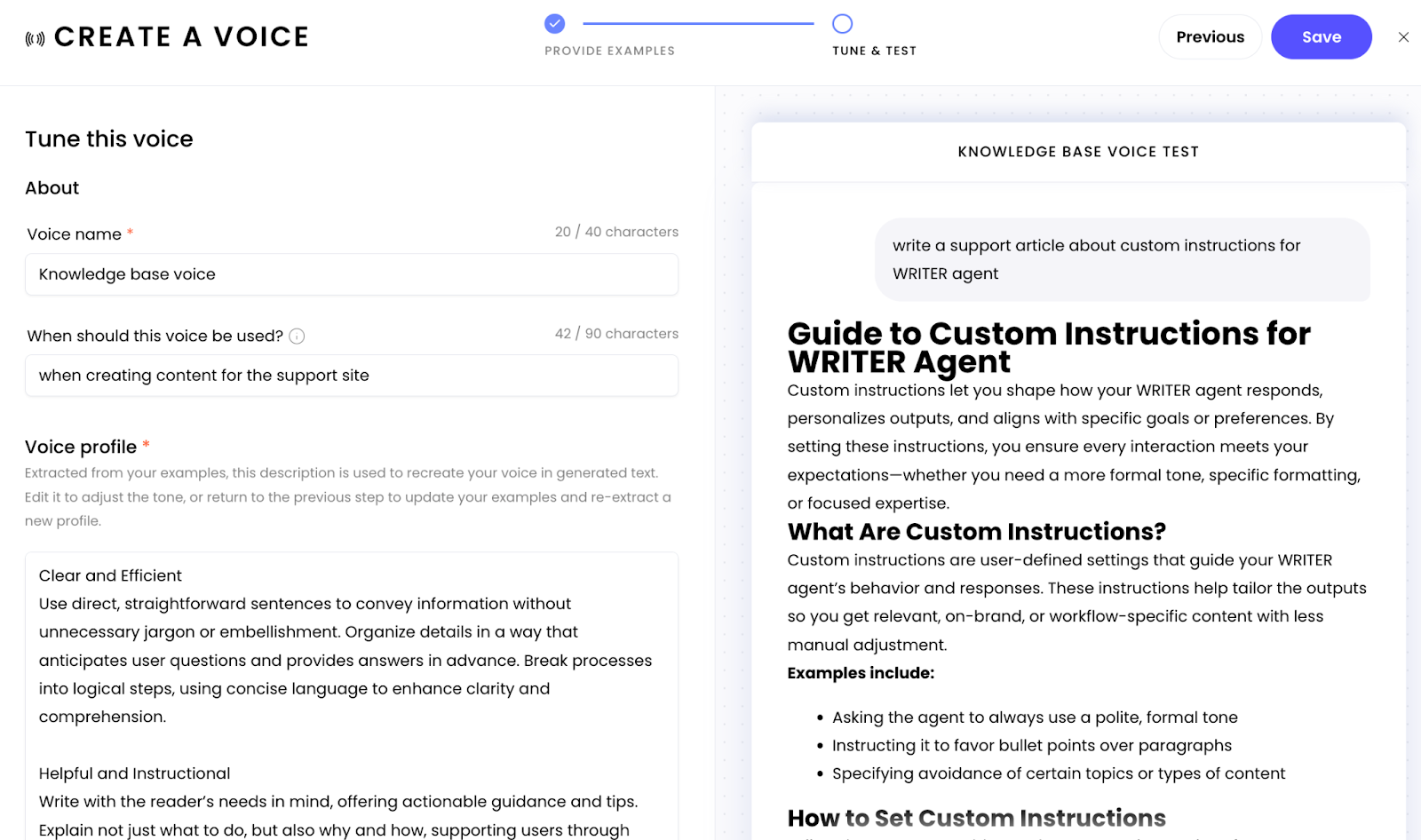 WRITER's testing shows that voices created from examples consistently perform better than manually written descriptions. When you provide examples, WRITER can reverse-engineer your actual writing style, tone, vocabulary, and cadence. This results in more accurate, brand-aligned outputs compared to manually specified descriptions.