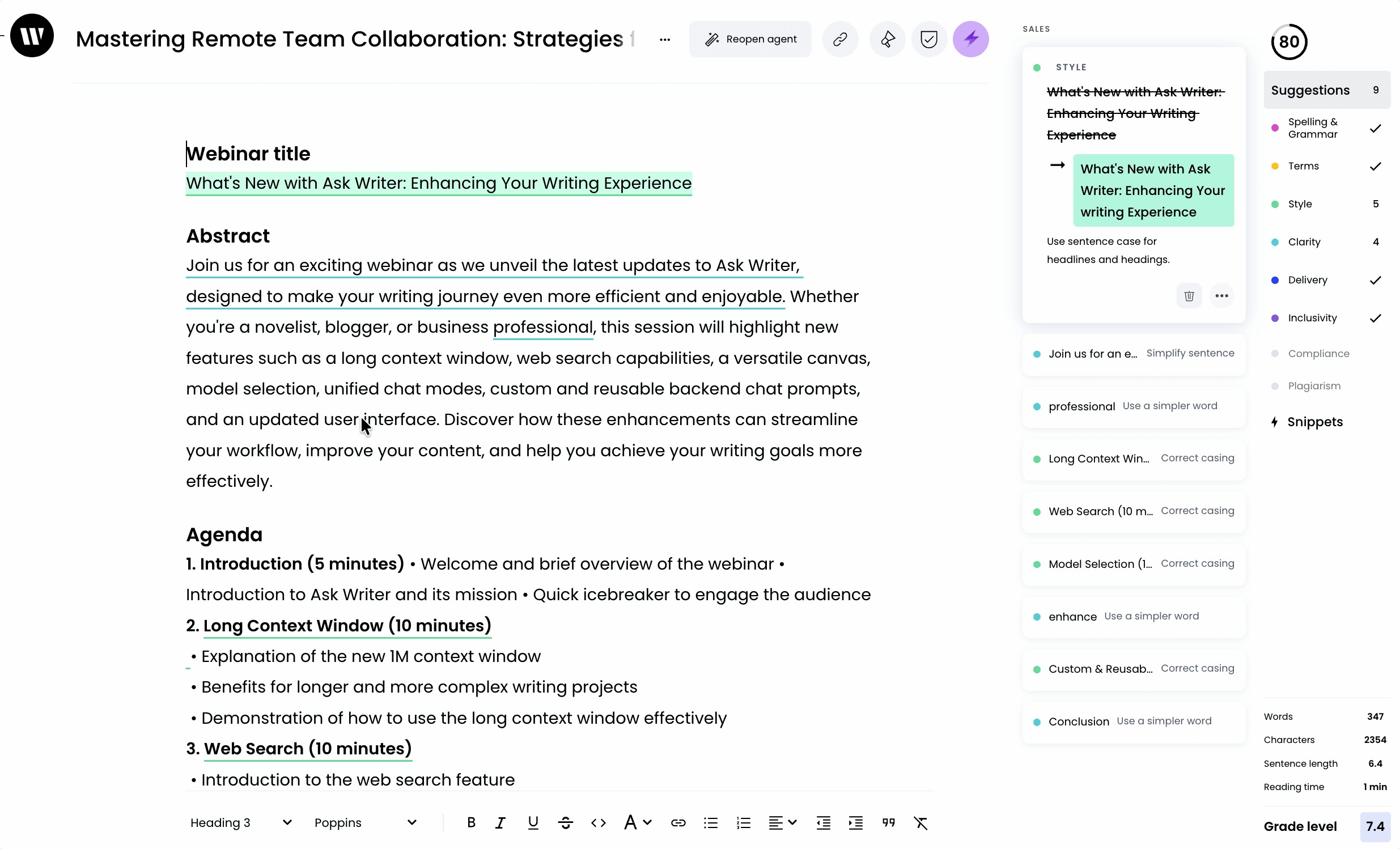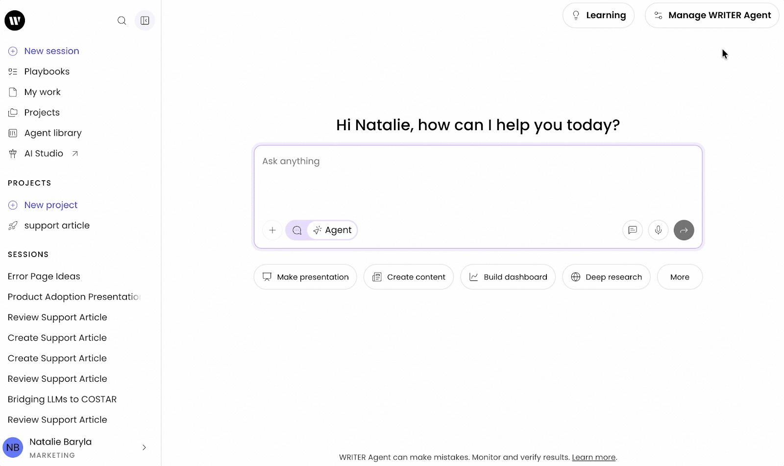 With WRITER Agent, you can brainstorm, draft, and refine ideas through natural conversation, or instantly analyze and act on large amounts of information. WRITER Agent is customizable and allows every user to fine-tune the outputs by creating a personal voice.