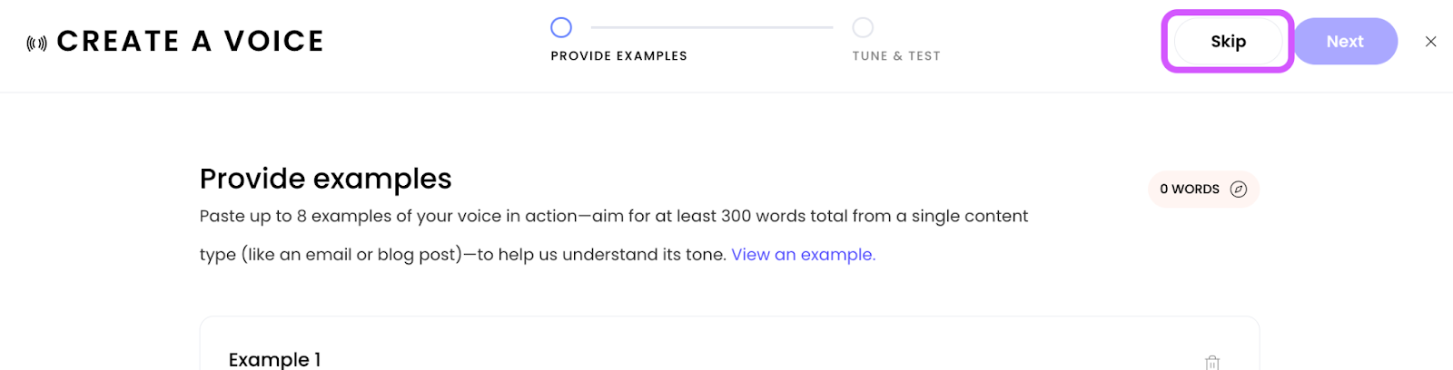 ⚠️ Note: While you can skip the examples step, our internal testing shows that voice profiles created from examples consistently generate better, more brand-aligned outputs than manually written descriptions. For best results, we recommend creating voices from examples.