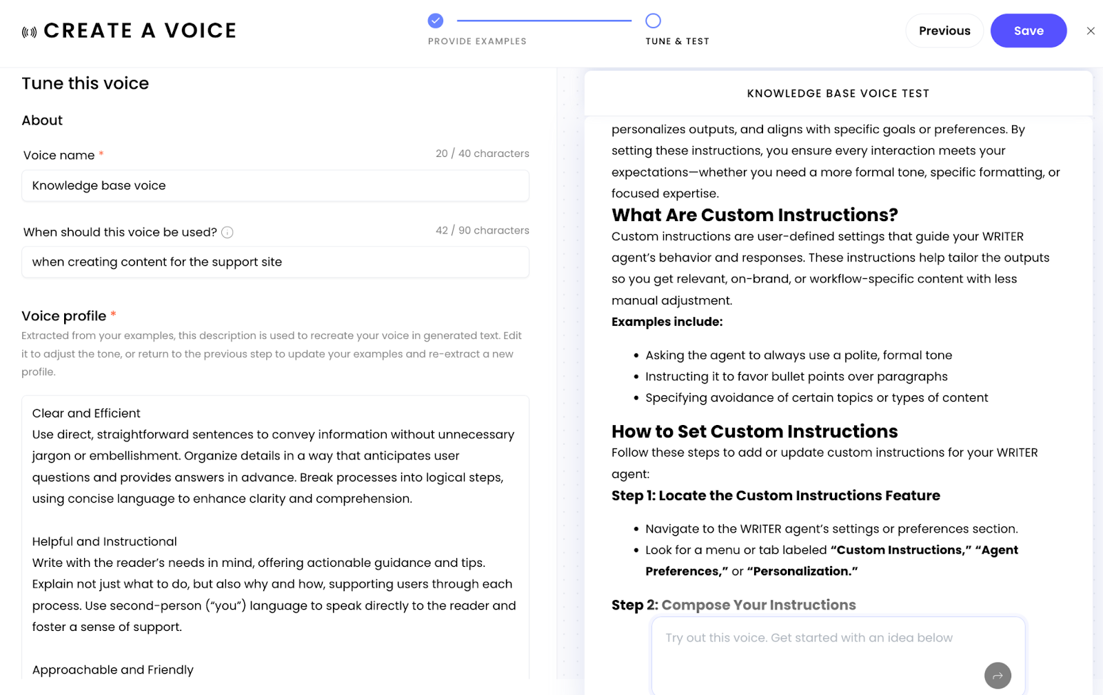 - Test the voice using the window on the right to ensure the content is sounding on-brand. If not, adjust the voice profile or go back through the previous steps and add more examples.