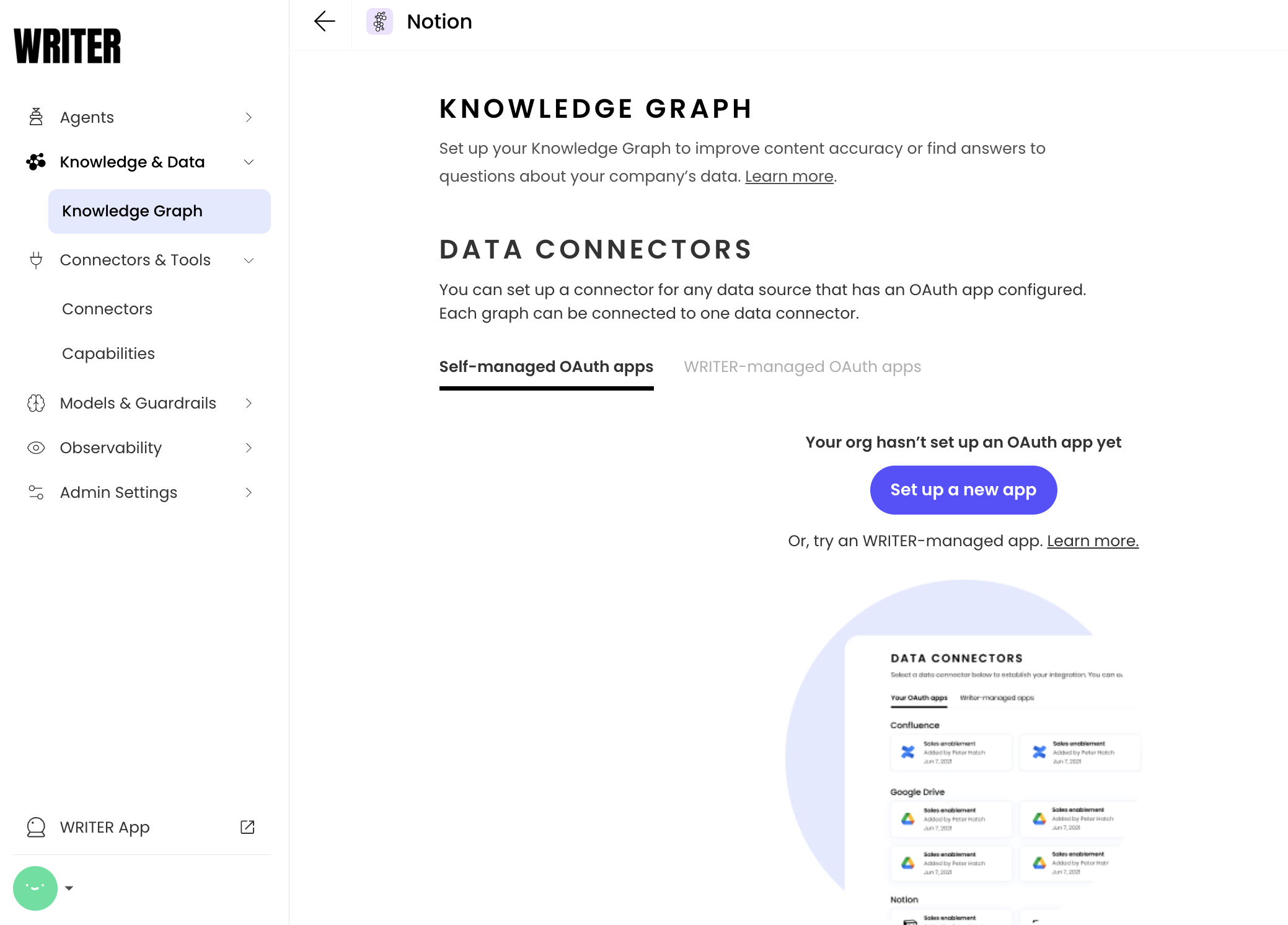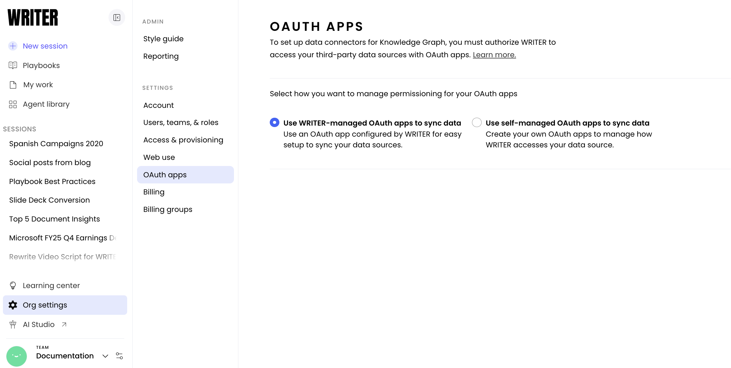 Before you can begin connecting your data sources to WRITER, you need to choose how to manage your OAuth apps: