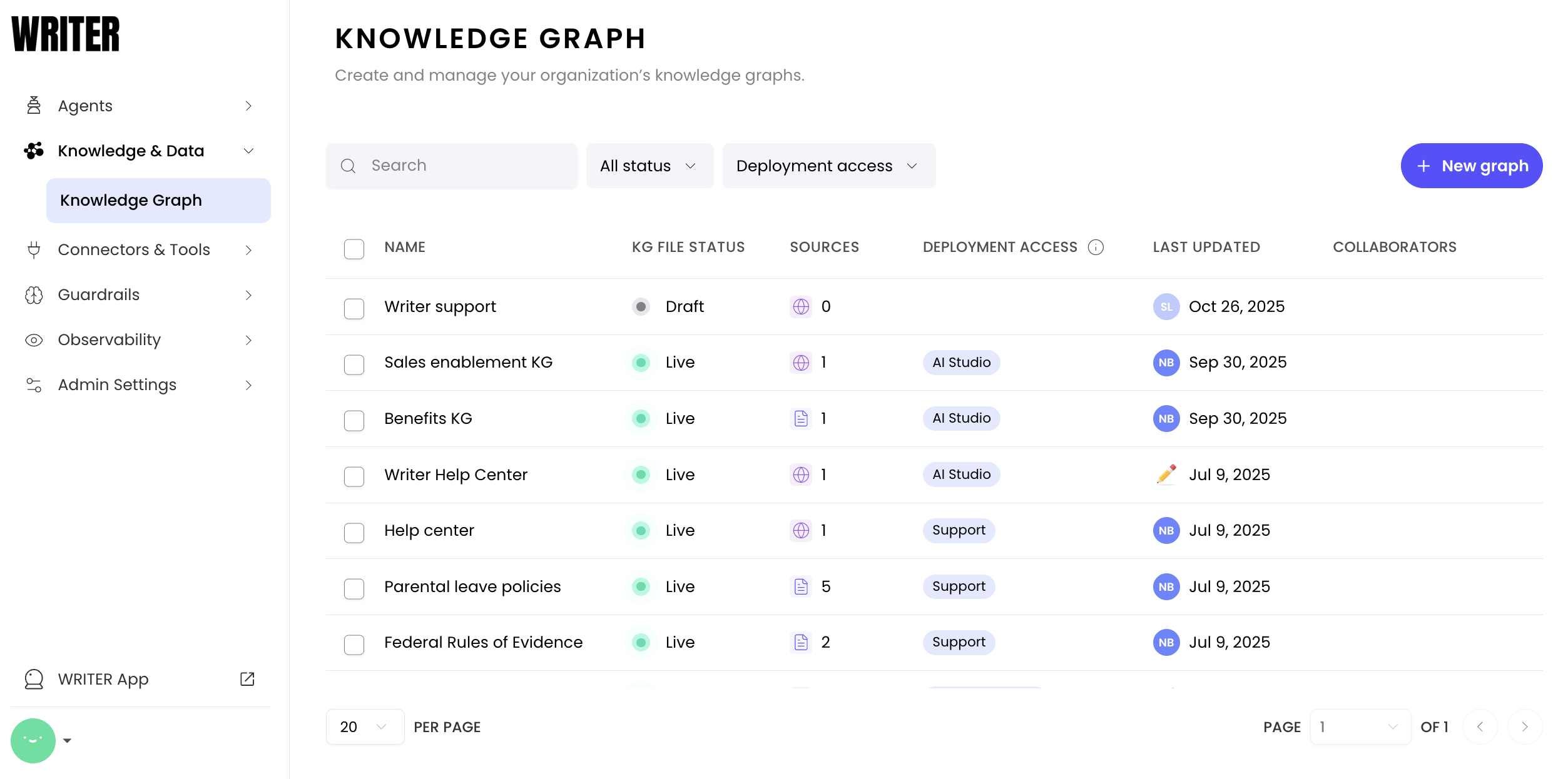 WRITER will display a list of the files within your Knowledge Graph, including the file type, the file status, which user added the file, and when the file was added.