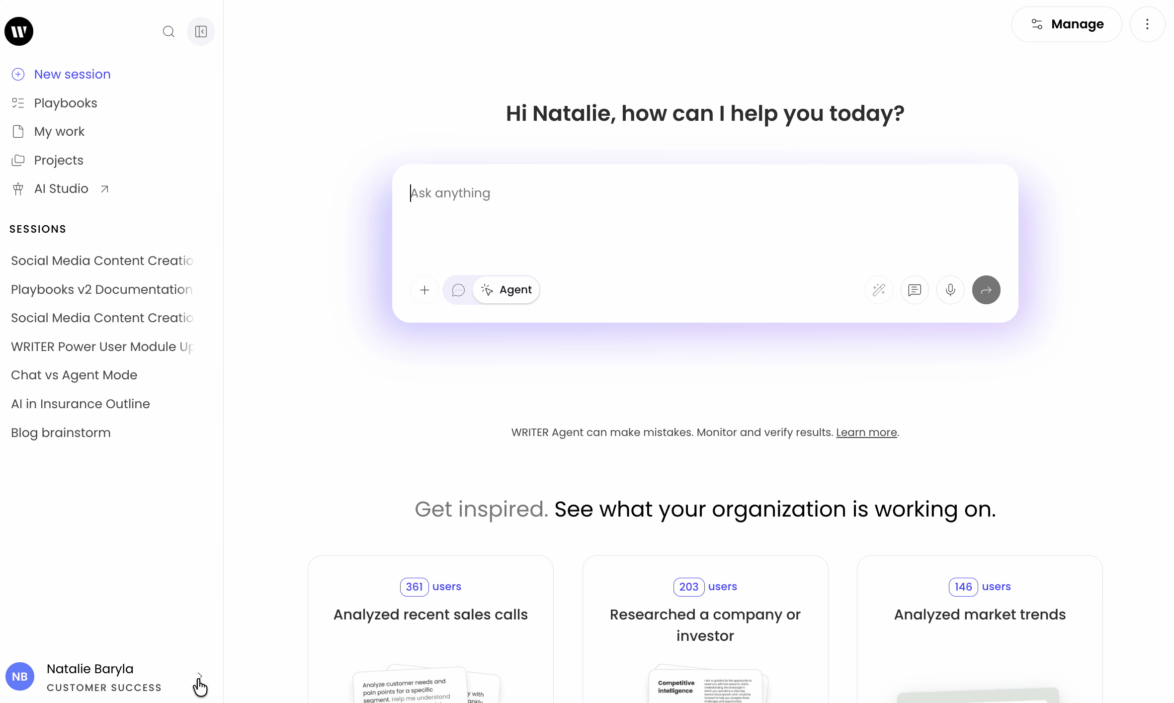 - Chat sessions - All chat sessions created by users, including in Ask WRITER or in any prebuilt or custom agents.