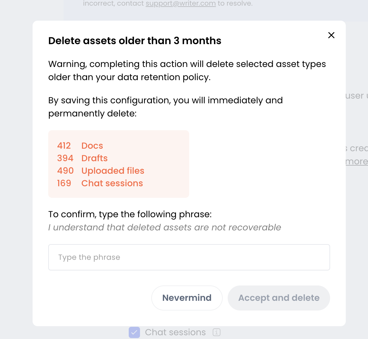 NOTE: Typing in the confirmation phrase and selecting Accept and delete will result in the immediate deletion of the affected files. This action is irreversible. There is nothing WRITER can do to restore deleted files, even if you immediately select a different deletion schedule.