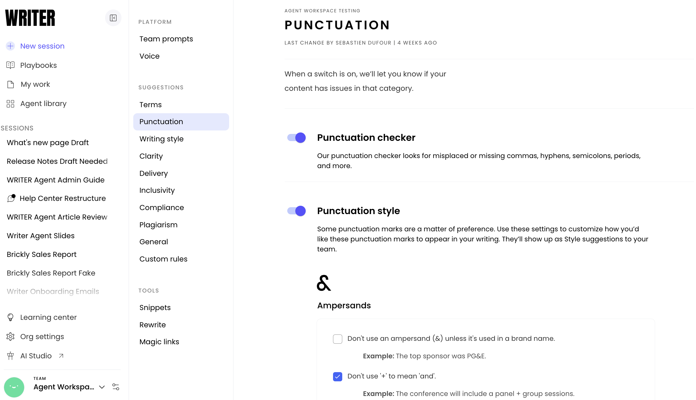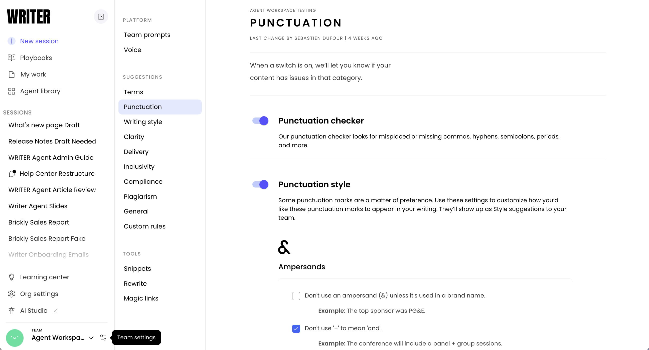 WRITER already has default suggestions settings in place from the moment you create your account. You can customize suggestions in WRITER Agent. Remember that updates to suggestions settings apply to your whole team, not just you.