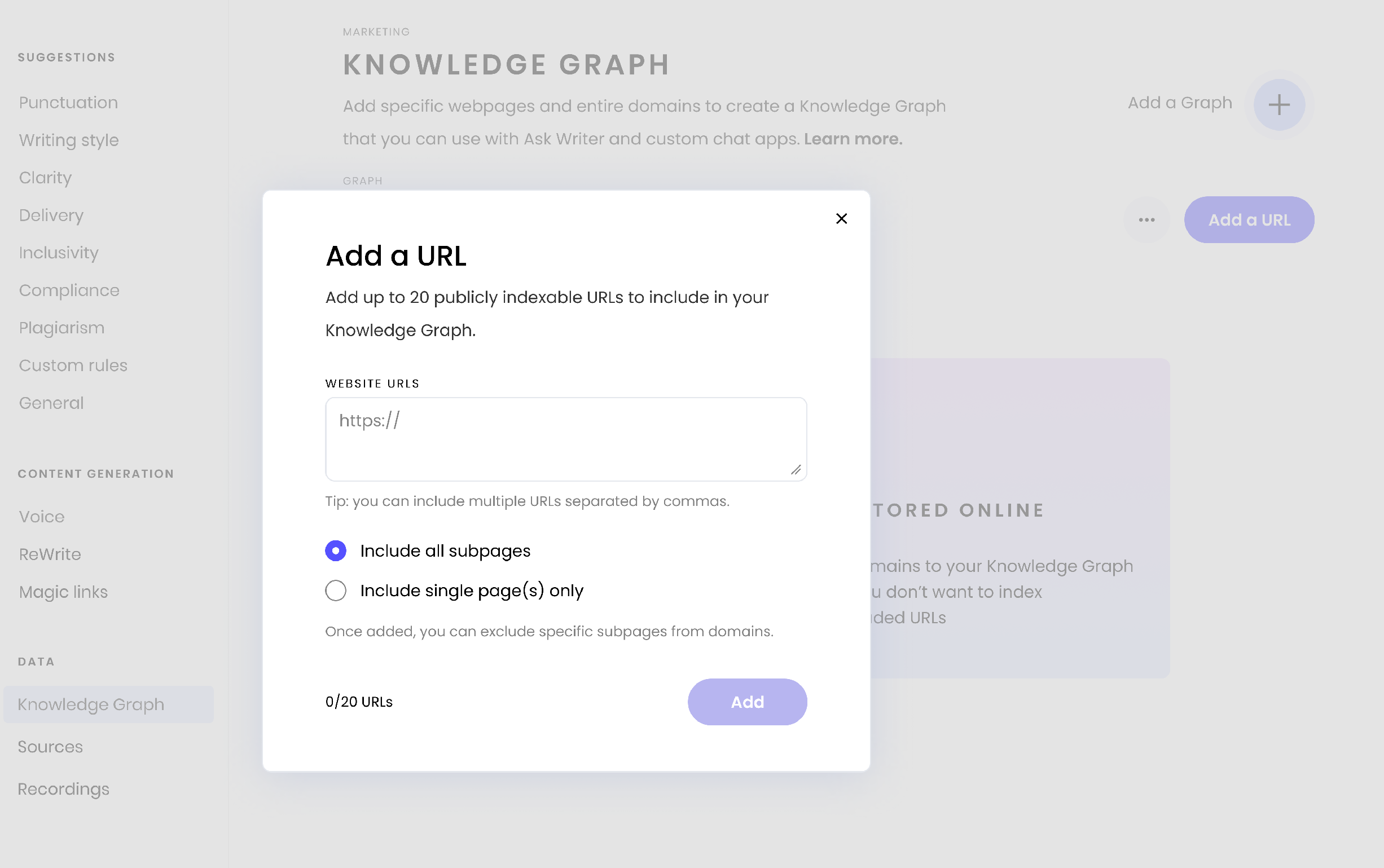 Add specific webpages and entire domains to create a Knowledge Graph that you can use with Ask WRITER and custom chat agents.