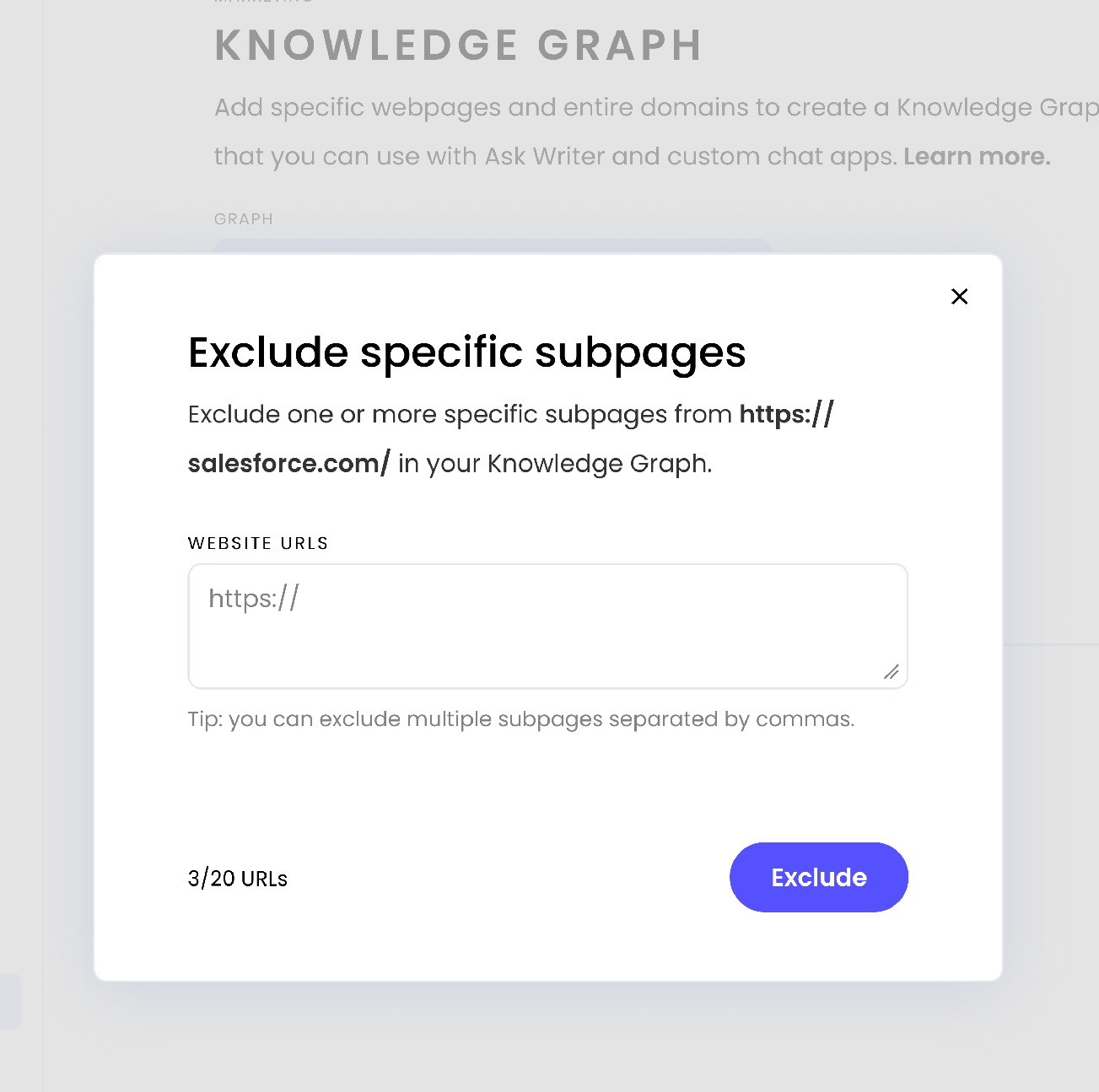 Enter the URL of the website(s) you'd like to exclude from your Knowledge Graph and select Exclude.