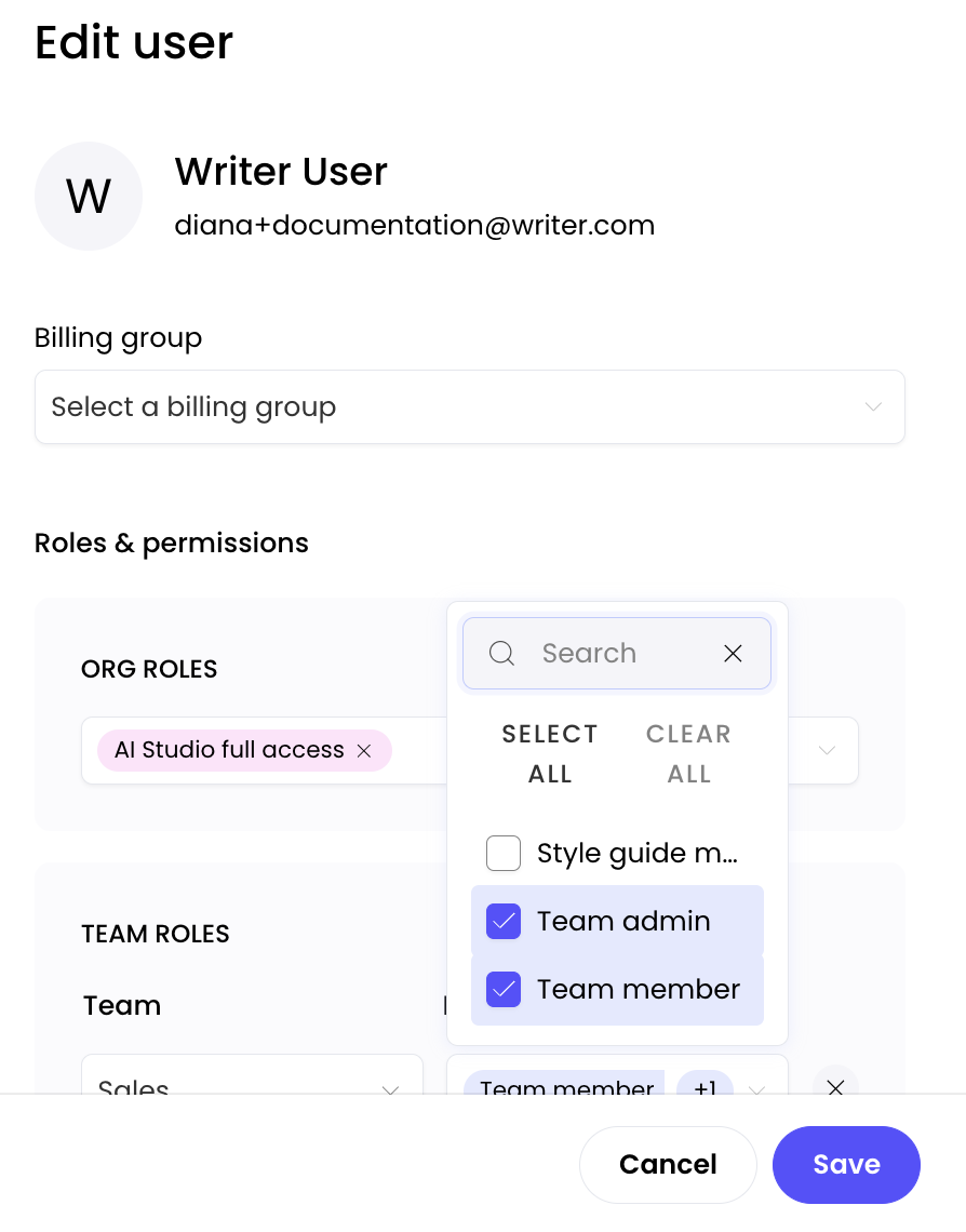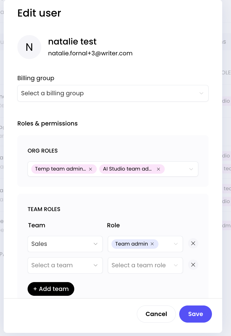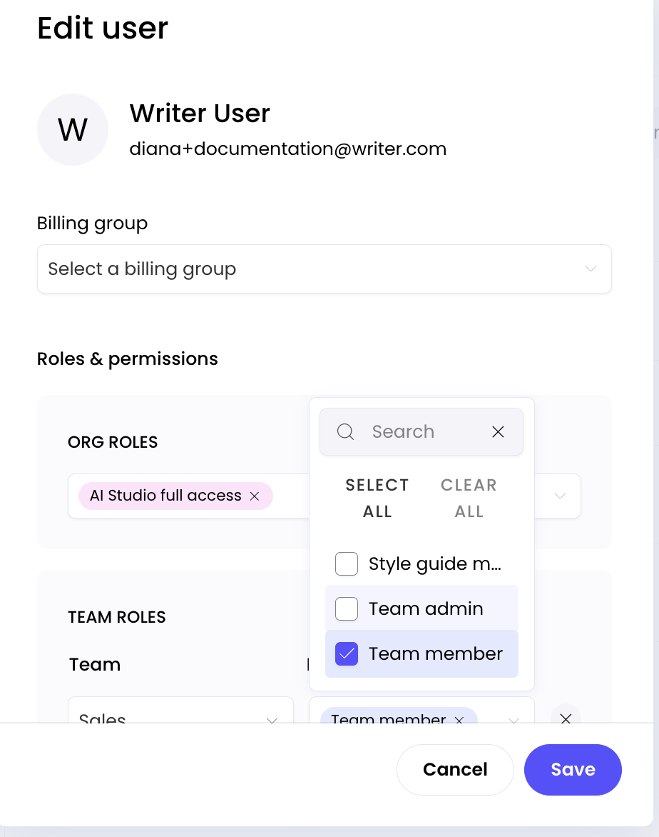 Enter the email address of the person you'd like to add to your WRITER org. You can add multiple email addresses at a time, separated by a comma – but all users will be given the same access role and team.