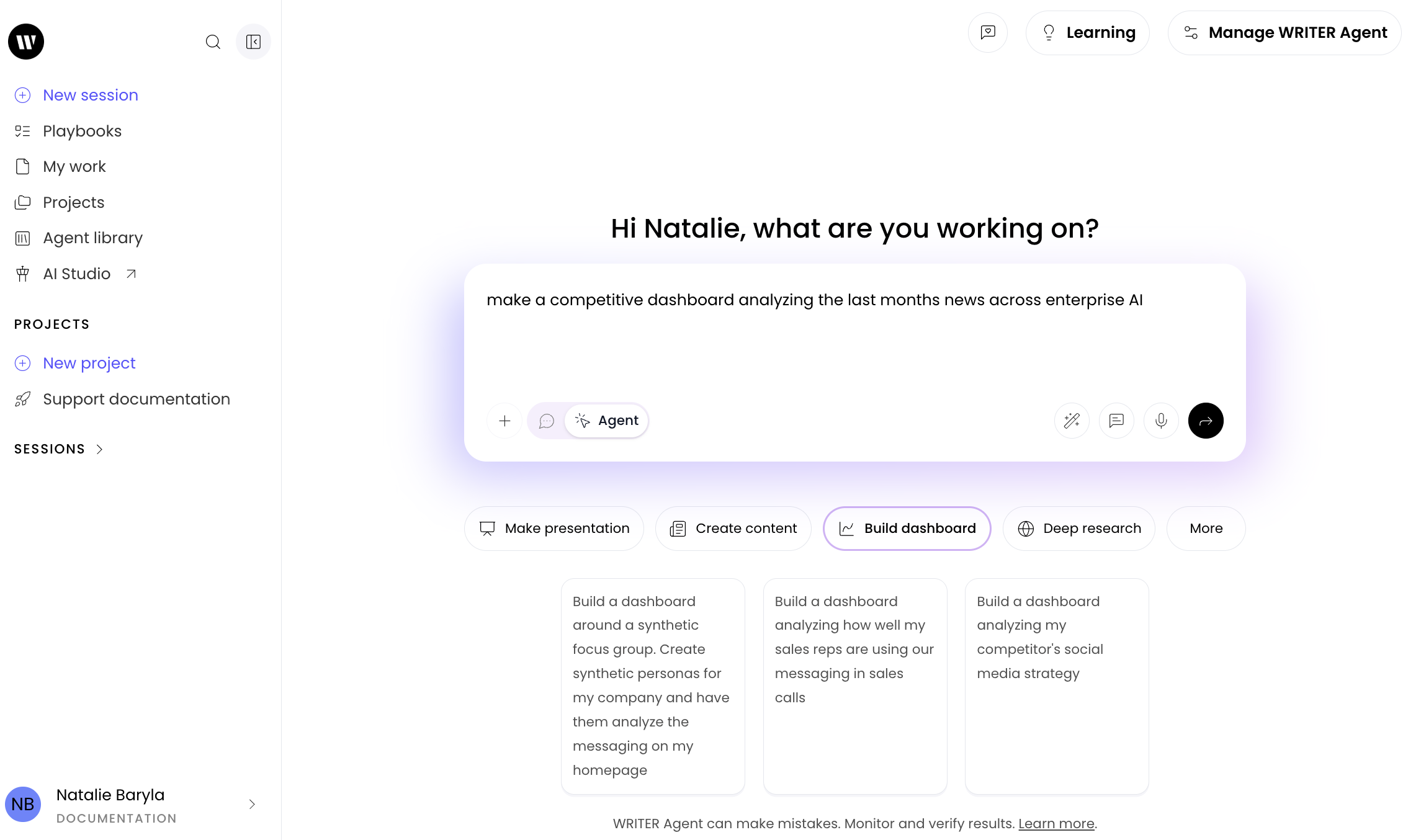 WRITER Agent is one intelligent interface that turns complexity into scale with repeatable, data-driven playbooks connected to the systems where work happens. Whether it’s content strategy or financial research, prospecting or merchandising, WRITER Agent is built to handle complex, unstructured work across every department and vertical.