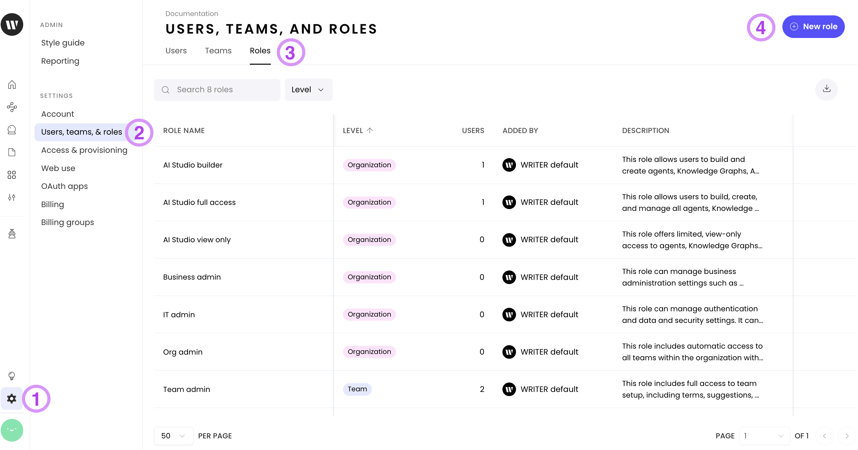 Recently the WRITER team moved Knowledge Graph creation and management into AI Studio. This change has impacted the ability for team admins to create or edit Knowledge Graphs as these users do not have access to AI Studio by default. While our team works to resolve the issue, you may create a custom role and apply it to team admins to grant them access to the Knowledge Management section in AI Studio. Follow the steps below to learn how.