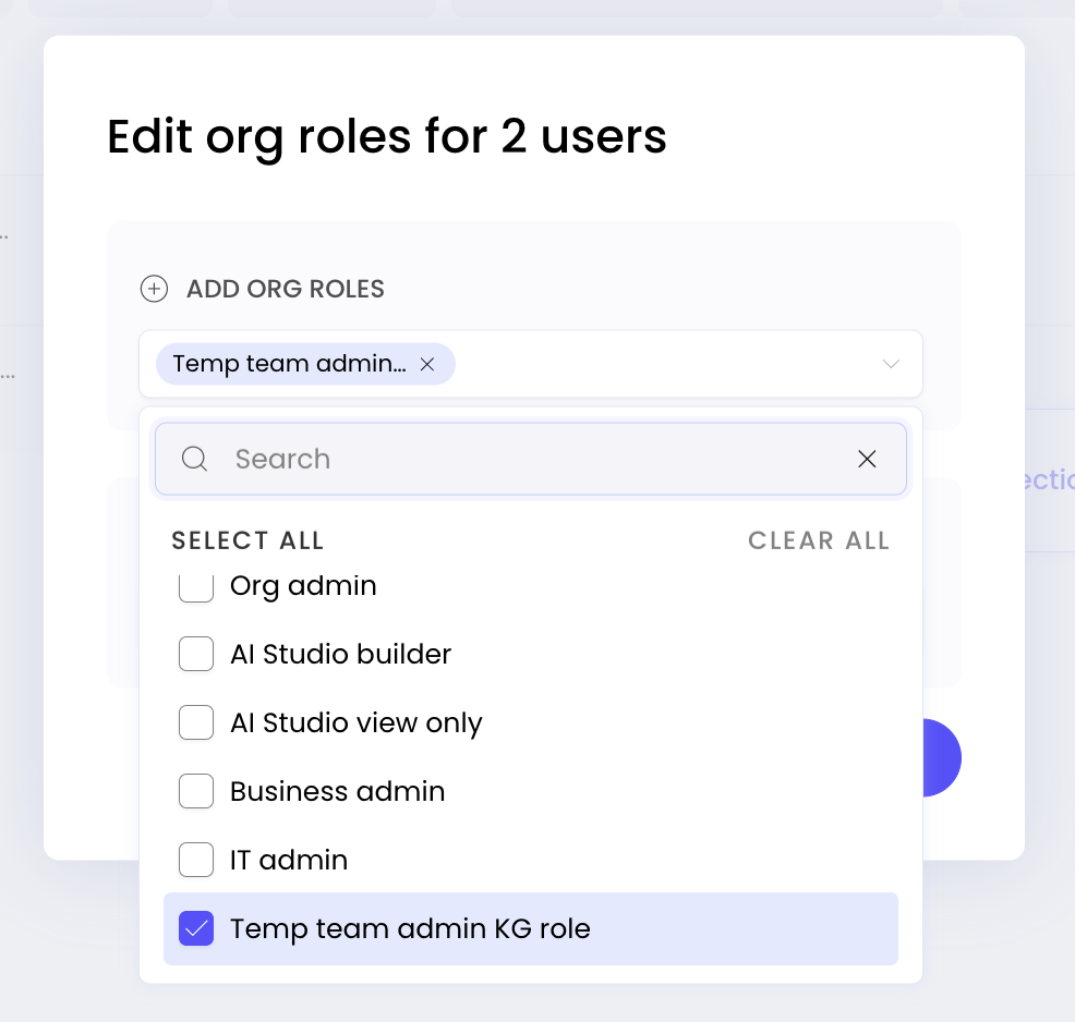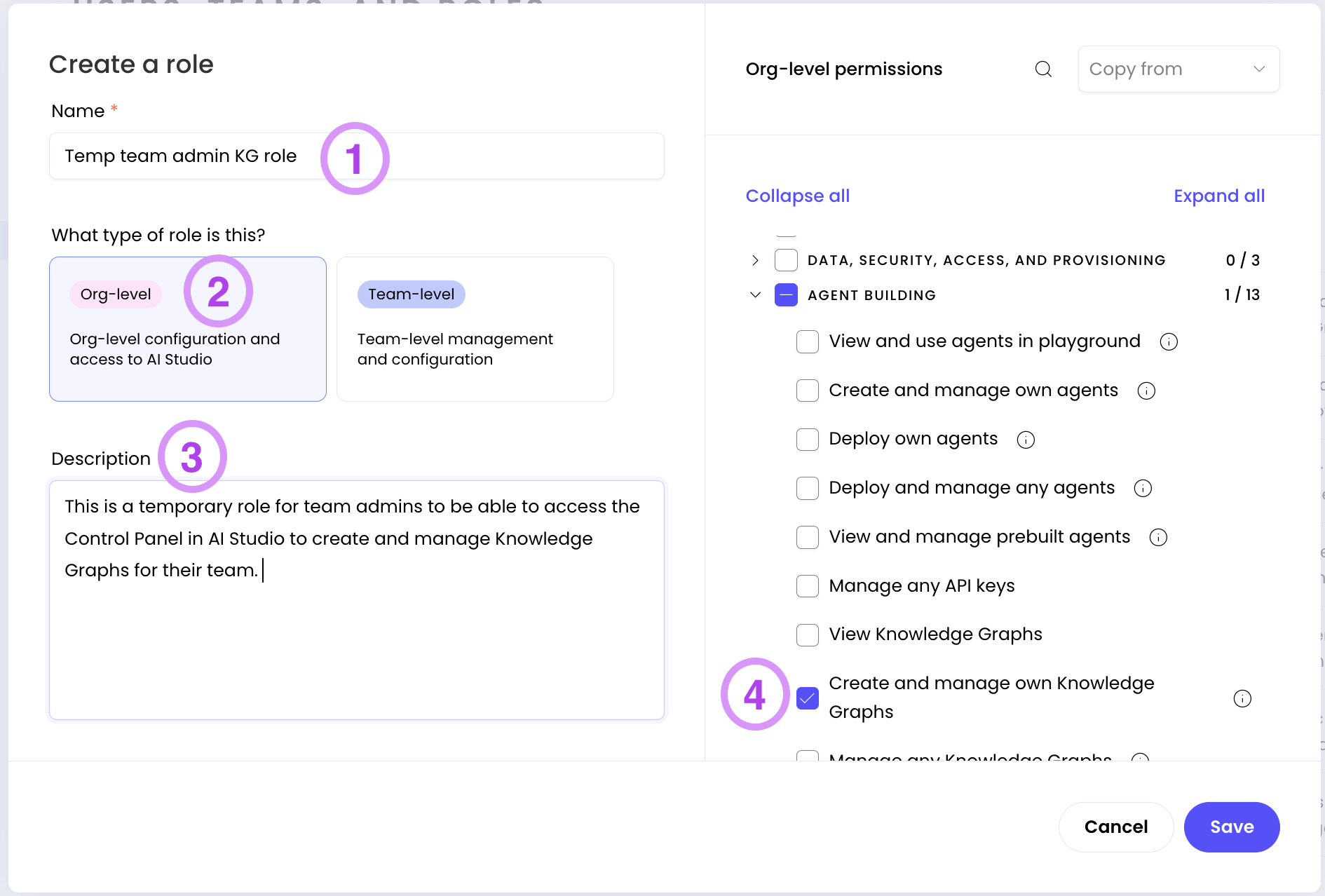 Finally, locate the role you created in the previous steps to select it from the list and save your changes to have this role applied to your team admins. Your team admins will now be able to see the AI Studio option from the left menu and access the Knowledge Graph page by selecting that link. To learn how to create and manage Knowledge Graphs, click here.