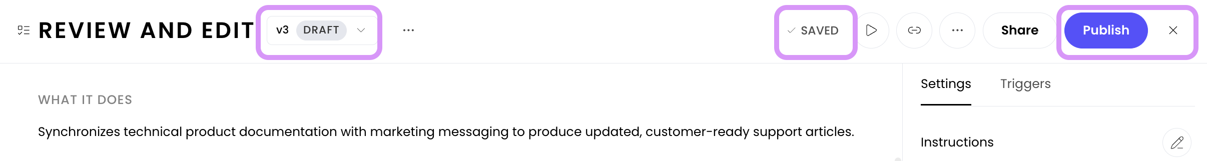 When you edit a playbook, WRITER automatically creates a draft version. This allows you to make changes, test them thoroughly, and publish updates without affecting people who are already using your playbook.
