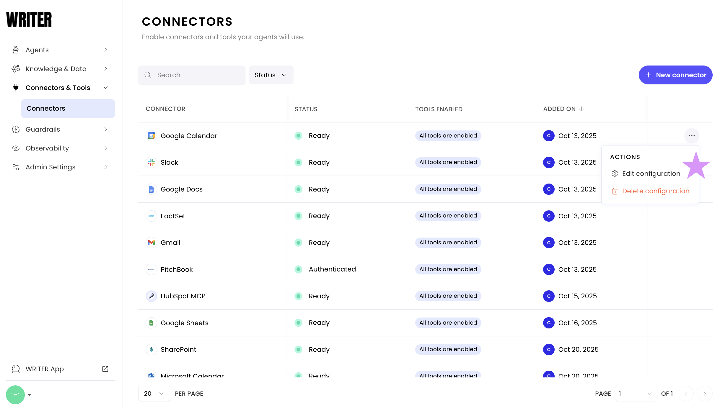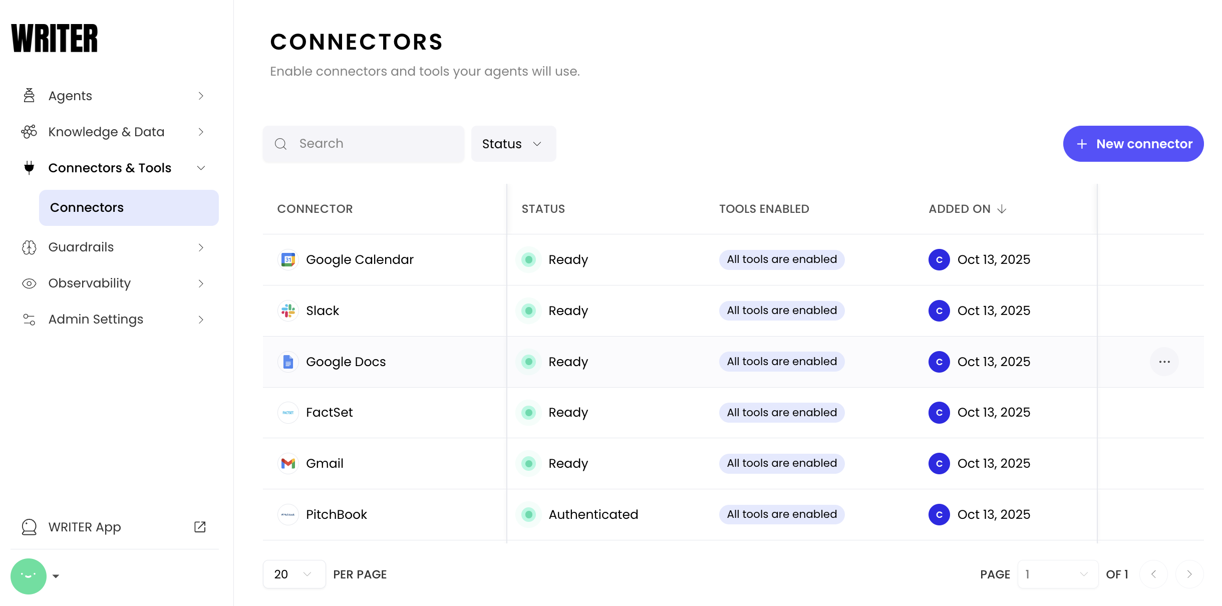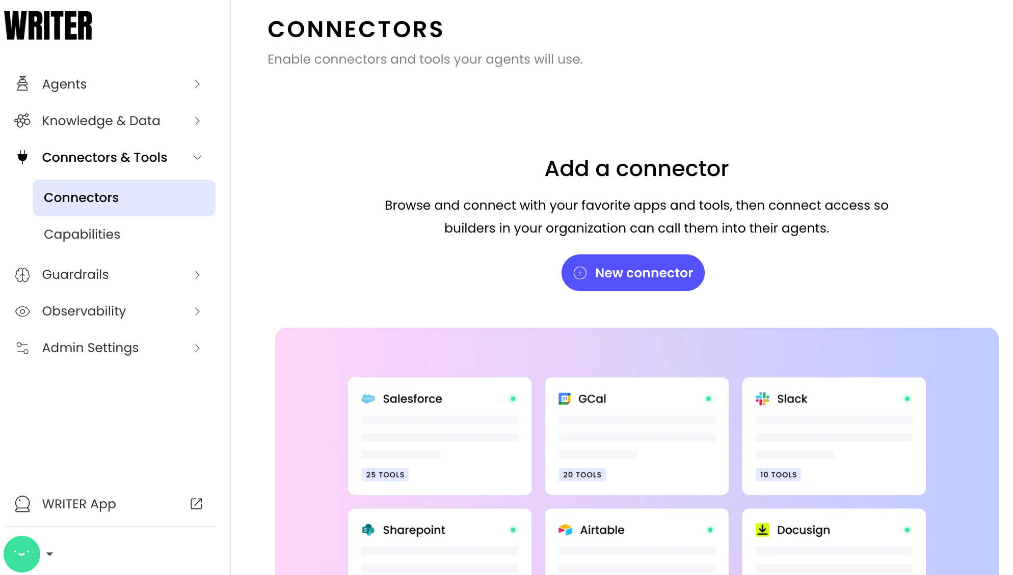 As a WRITER admin, you have access to the connectors control page — where you can manage and supervise tool access and usage by agents. Connectors are how agents get access to enterprise tools and data. They link WRITER agents (including Action Agent) to the apps, services, and systems where business context lives.