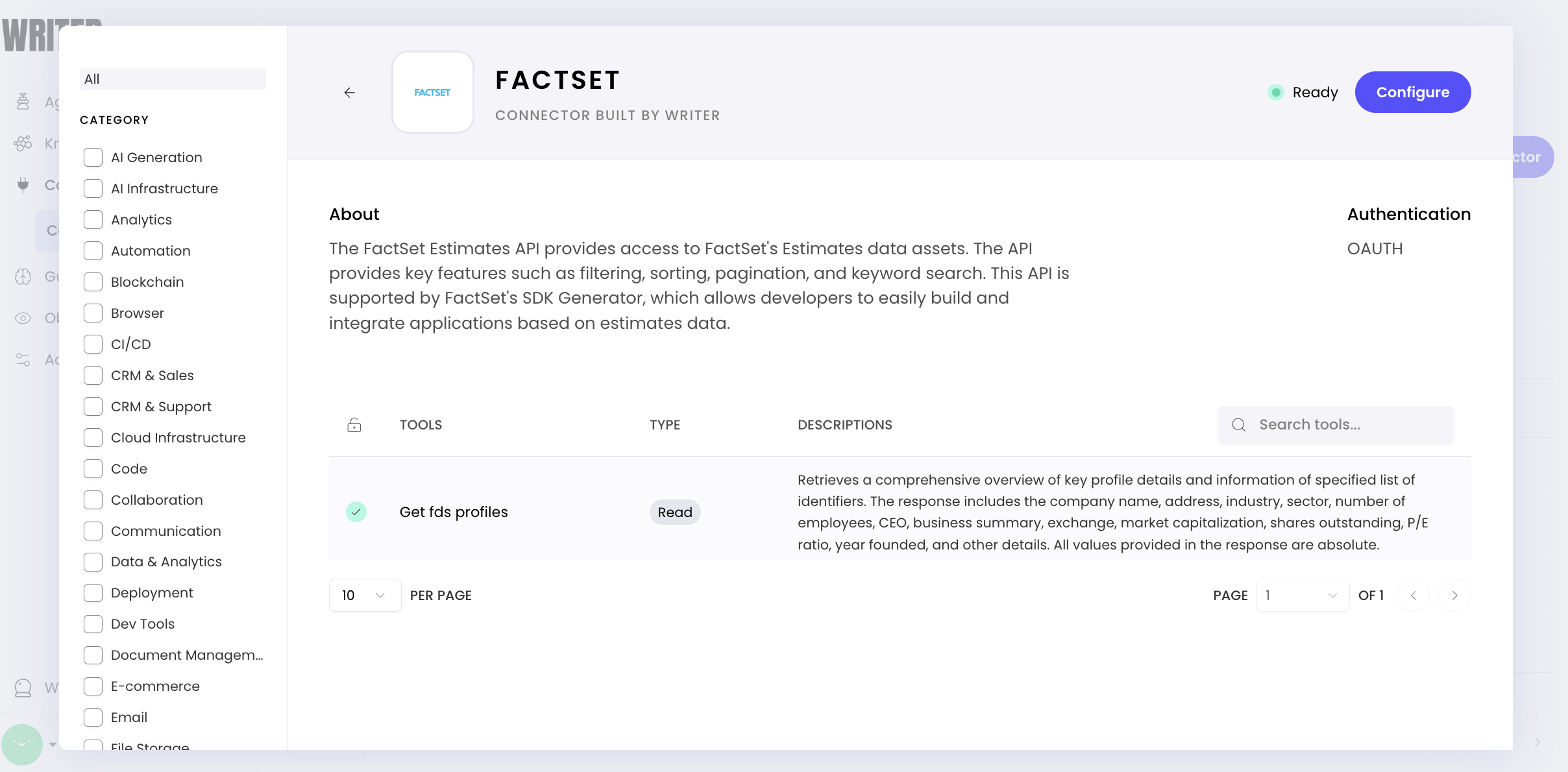 When you select Details you can learn about what tools within that connector will be able to do within WRITER agents. When configuring a connector you do not need to allow all the tools within that connector to be available to your users. When you select Configure in the top right you’ll be able to select which tools your users will have available to them.