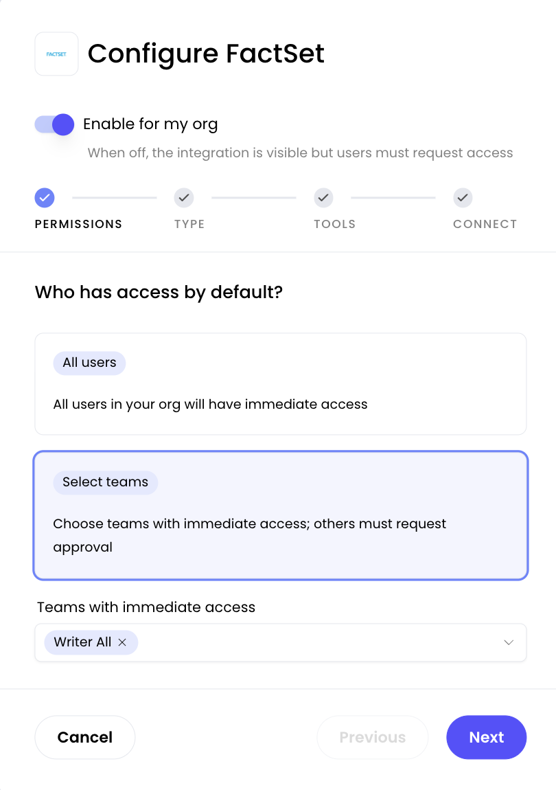 - Allowing All users will give all WRITER users within your org immediate access to the tools you enable within that connector.