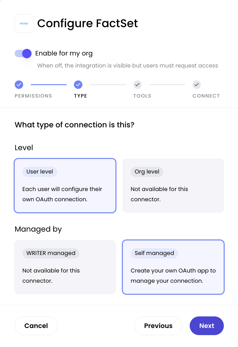From the configuration module, first select Enable for my org to activate the connector. Then select who in your WRITER org will have permission to use the connector within their agents.