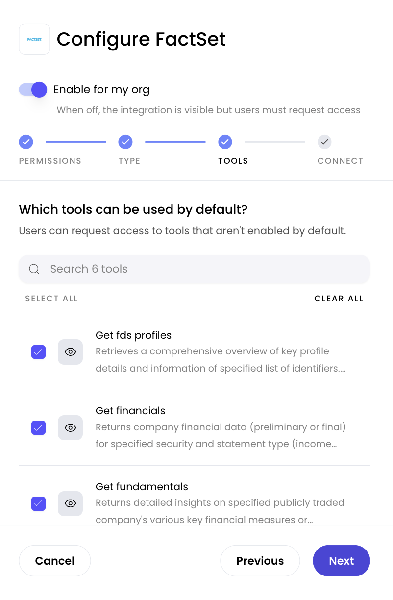 Within each Connector there are multiple tools available for your AI agents. The third step in the configuration module is where you will select the tools you’d like agents to be able to leverage. You can select all or any subset of tools based on your organization’s needs.