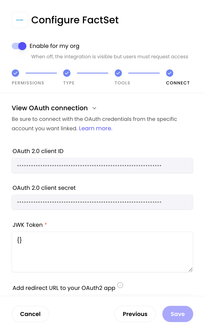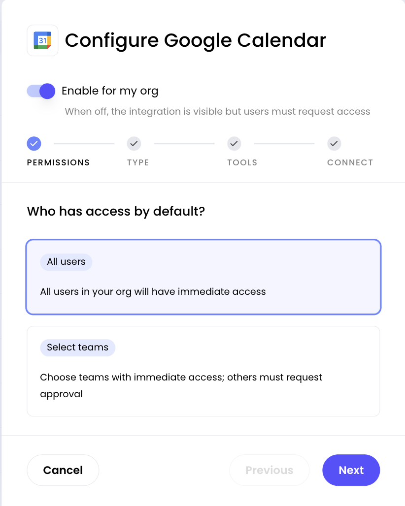 - Configure permissions for your organization, deciding whether end-users need approval to connect their services.