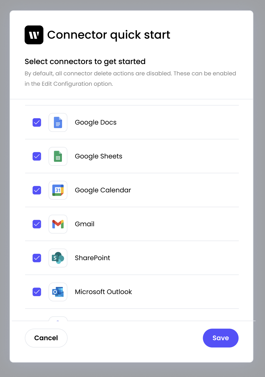 Quickly enable your teams to authenticate their accounts by selecting the connectors from the quick start list. Select Save and these connectors will be added to WRITER managed OAuth apps and they will then be made available in WRITER Agent for your users.
