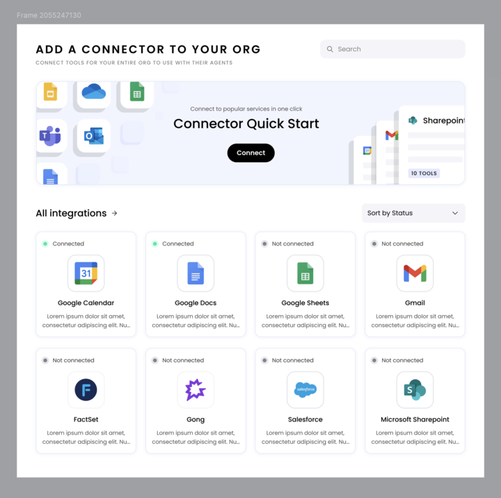 Every connector has a set of tools that give agents read (retrieve), write (act), or delete capabilities. The connectors control page gives you a bird's-eye view of all your integrations. It’s where you’ll manage and supervise how agents access and use your enterprise tools and data.