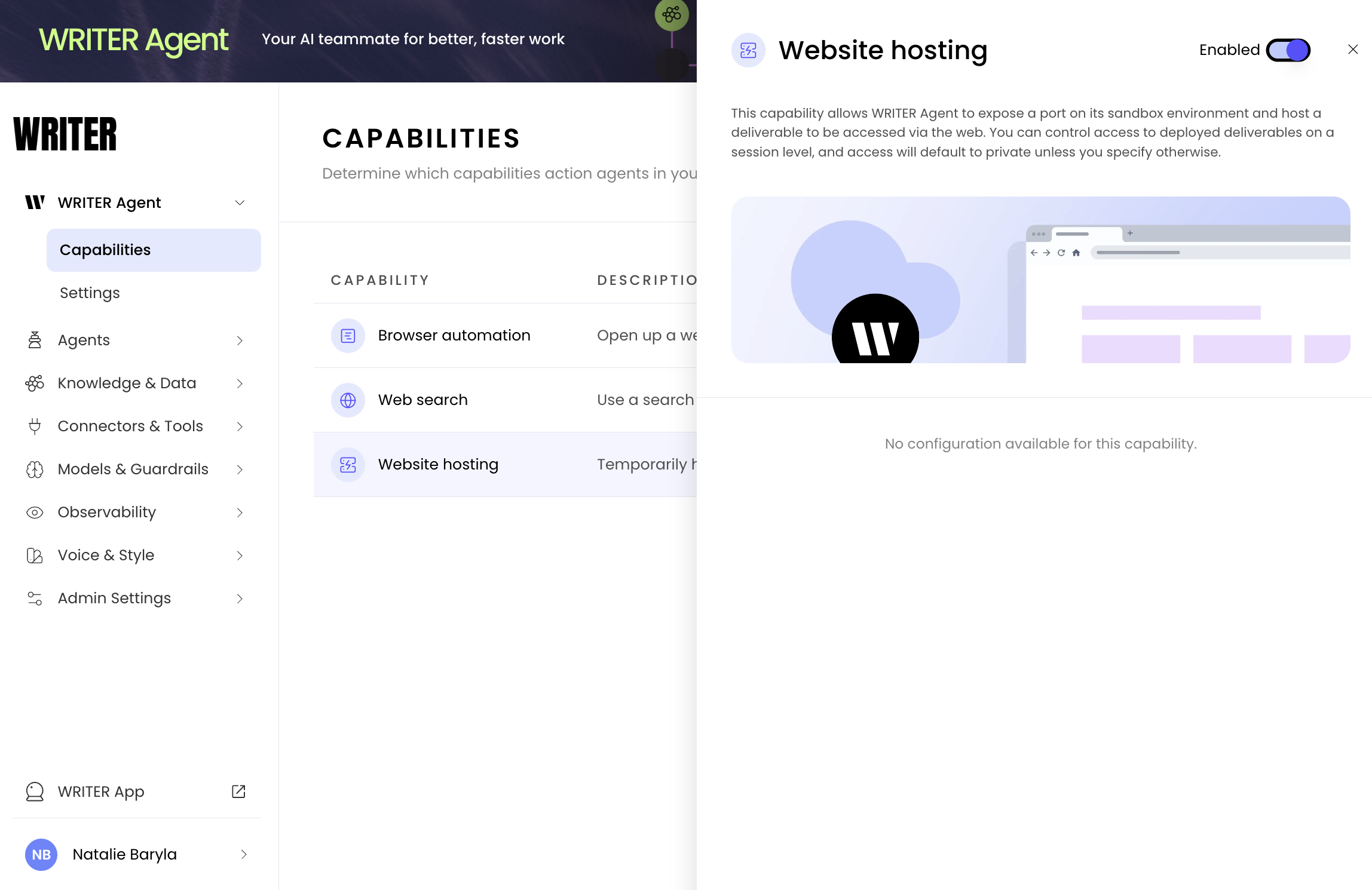 To enable or disable Website hosting navigate to WRITER Agent > Capabilities. Select Website hosting in the list and use the toggle switch to enable or disable the feature.