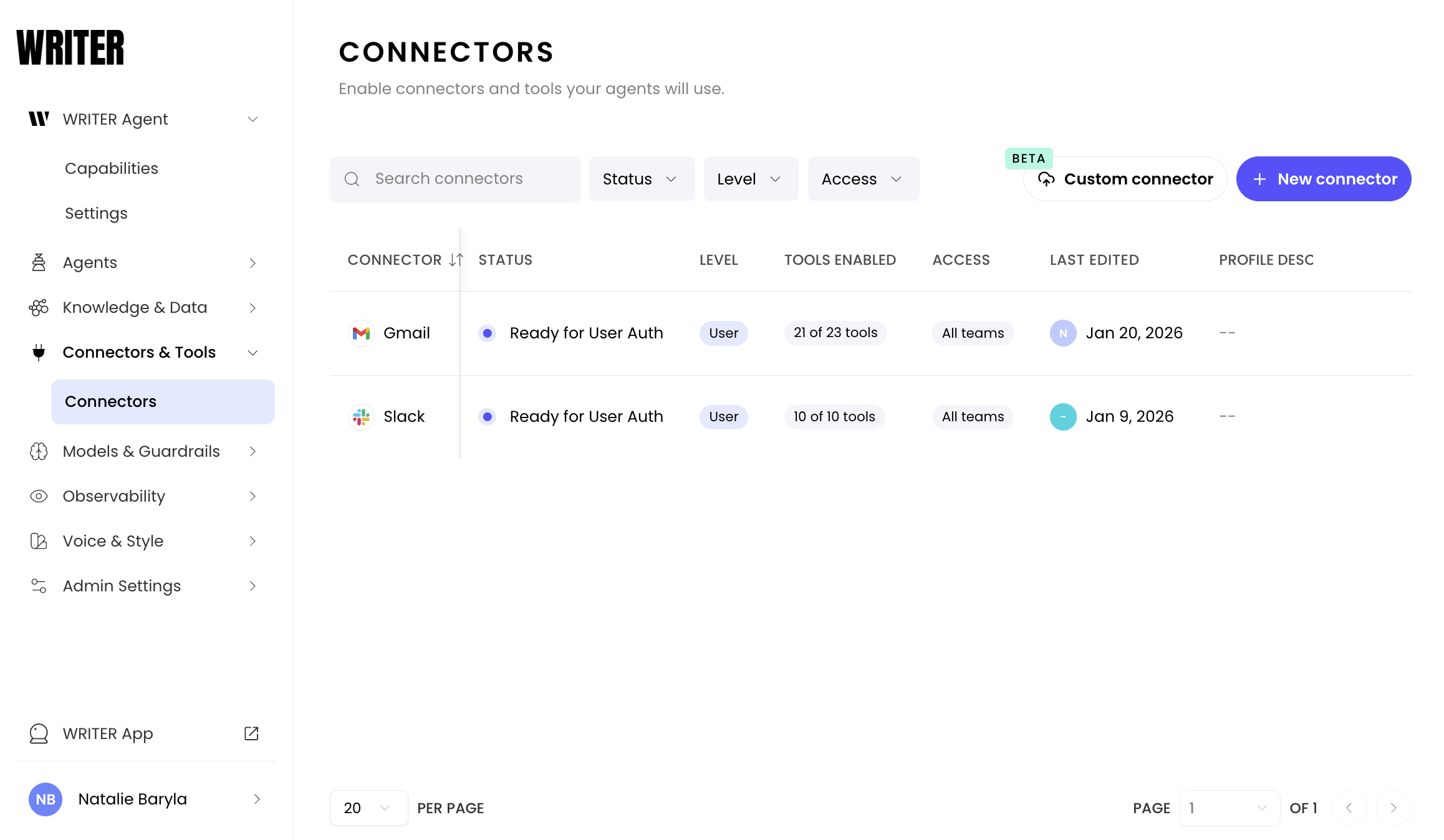 In addition to these core capabilities, you can also manage how WRITER Agent interacts with your organization's tools and platforms through Connectors.