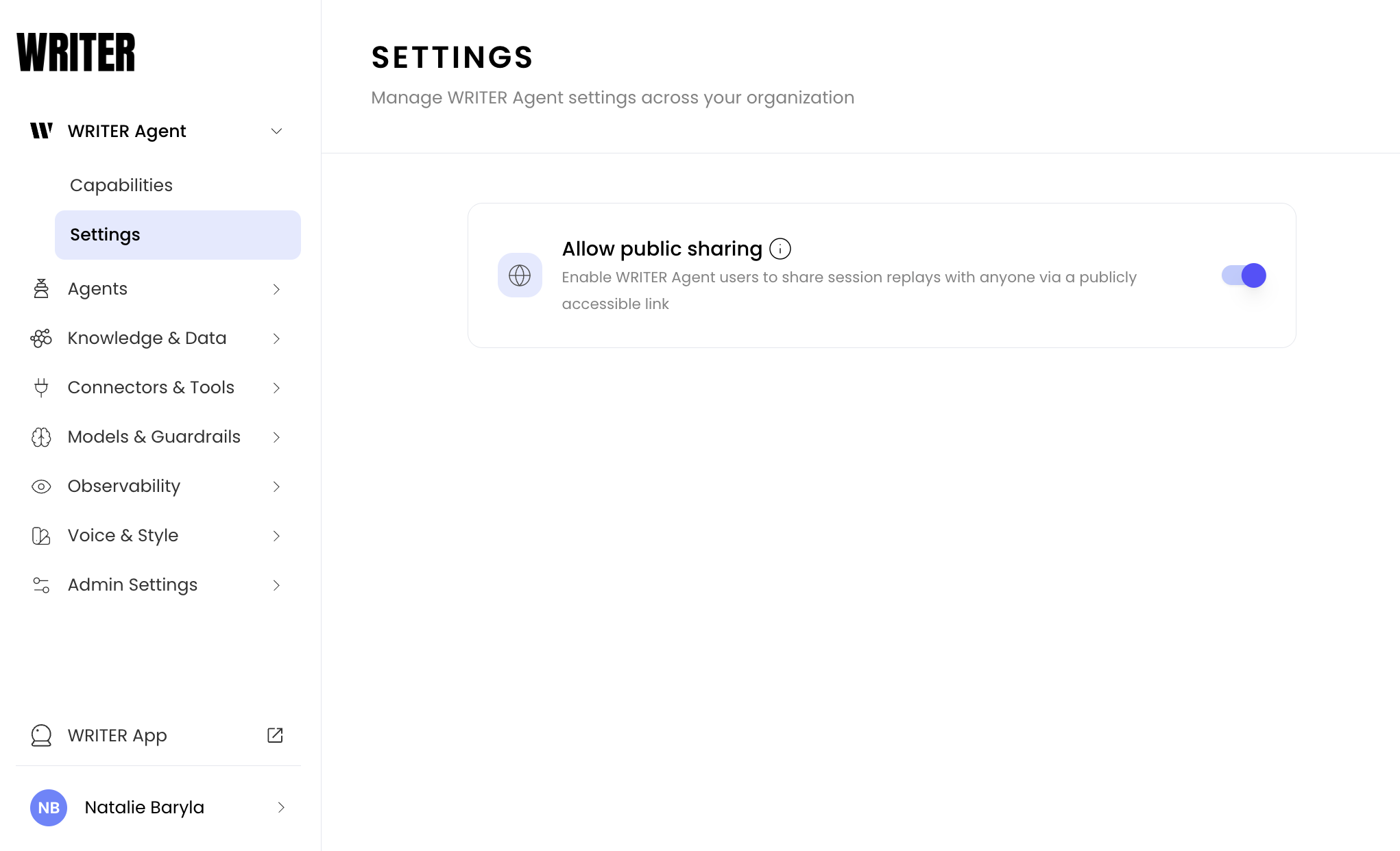 From within the WRITER Agent > Settings page you'll find a toggle that controls whether replays can be publicly shared to anyone with the link. If toggled off, users sharing WA session replays will not see the option to share with “anyone with the link”.