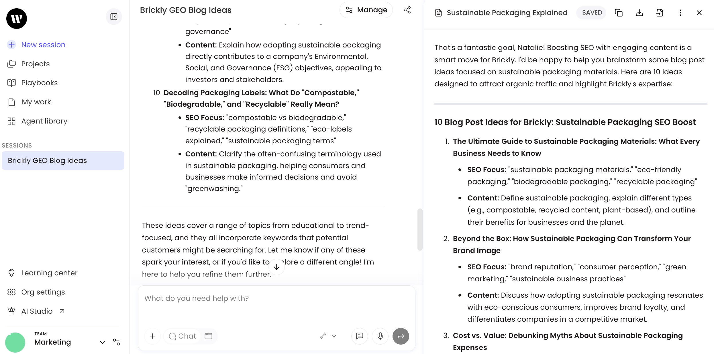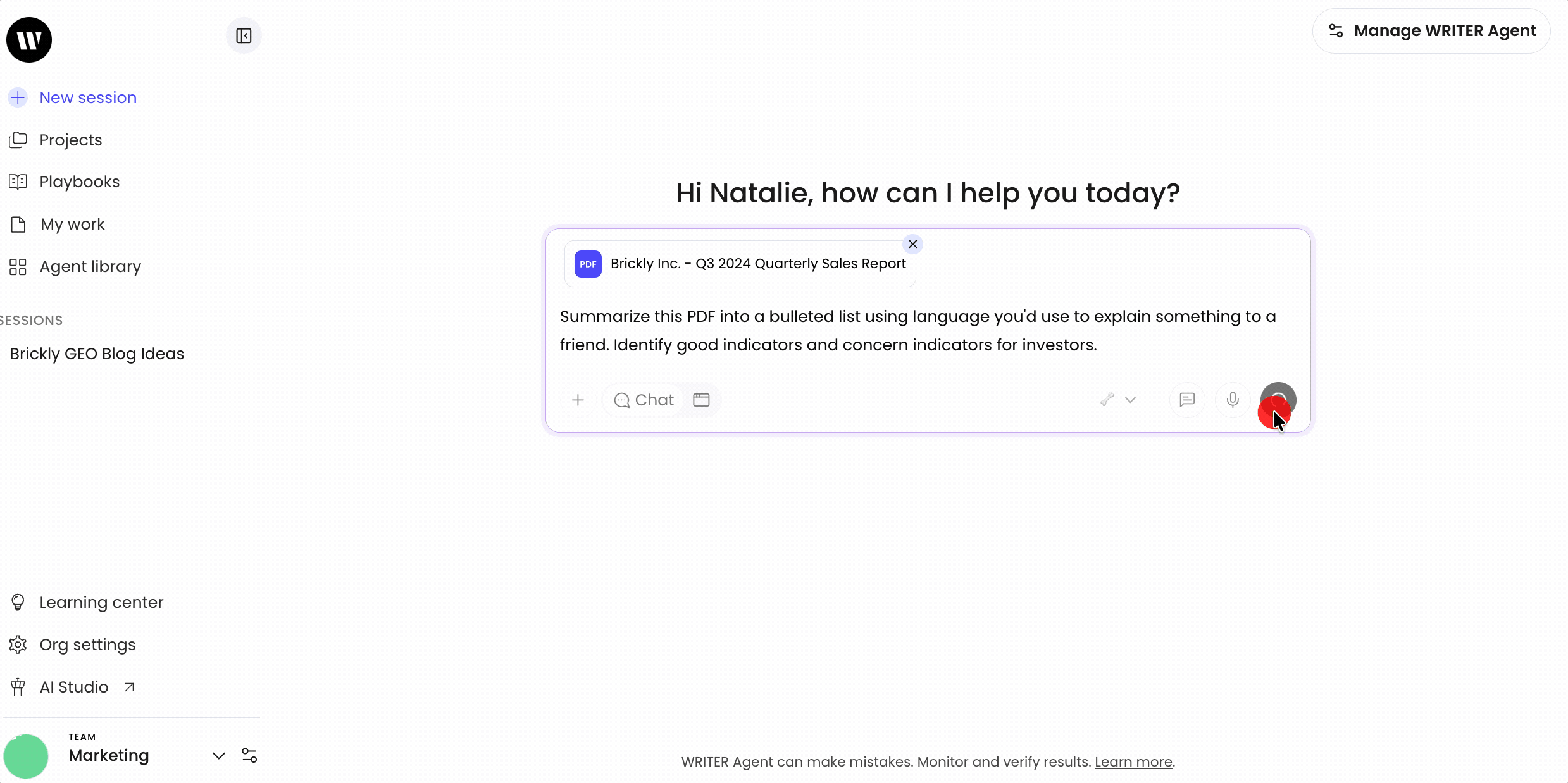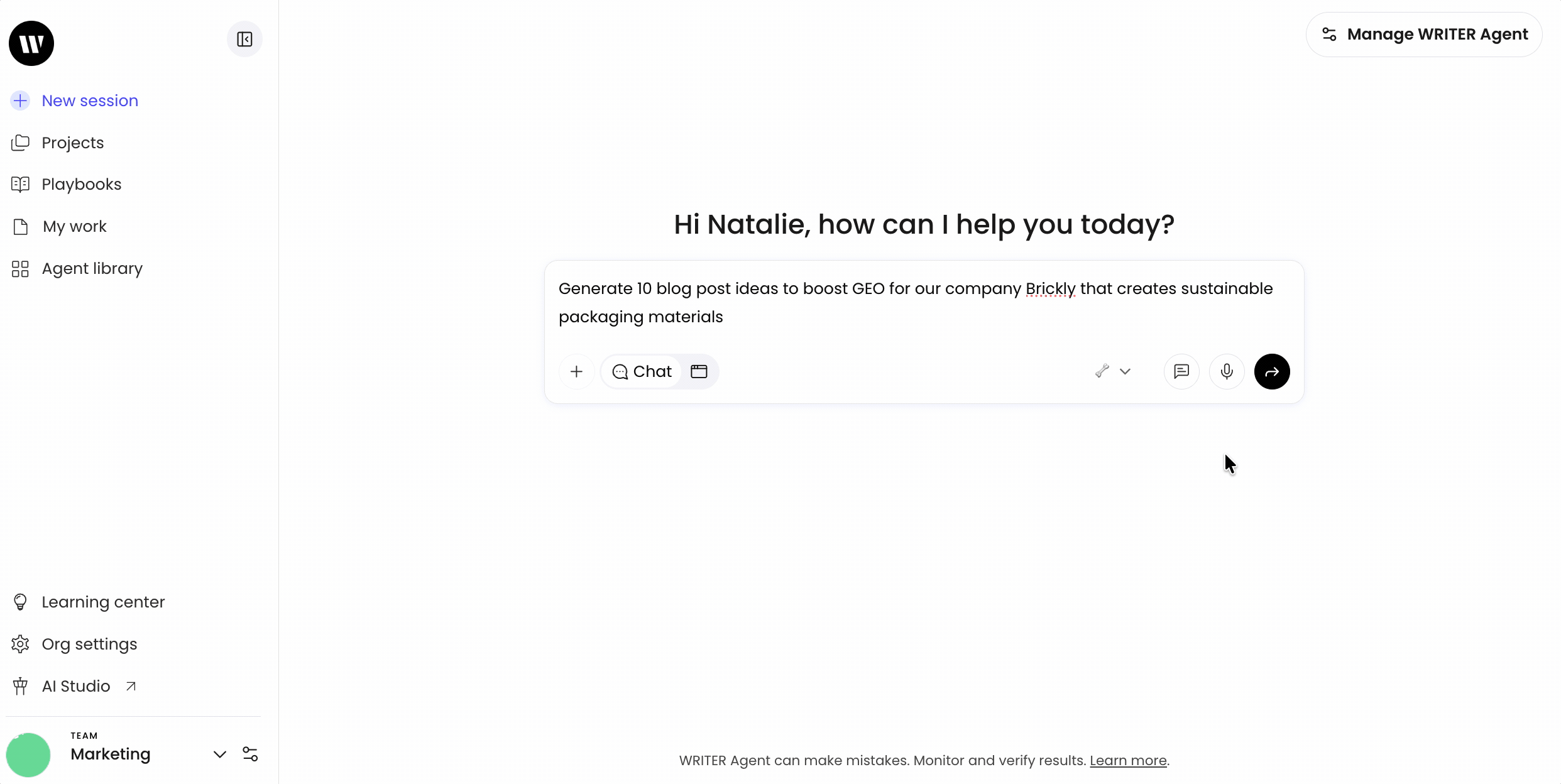 Once you select enter, you'll be taken to a new WRITER Agent session. You’ll see the output generated by WRITER Agent, and a new input chat box, where you can chat back and forth until you obtain your desired output.