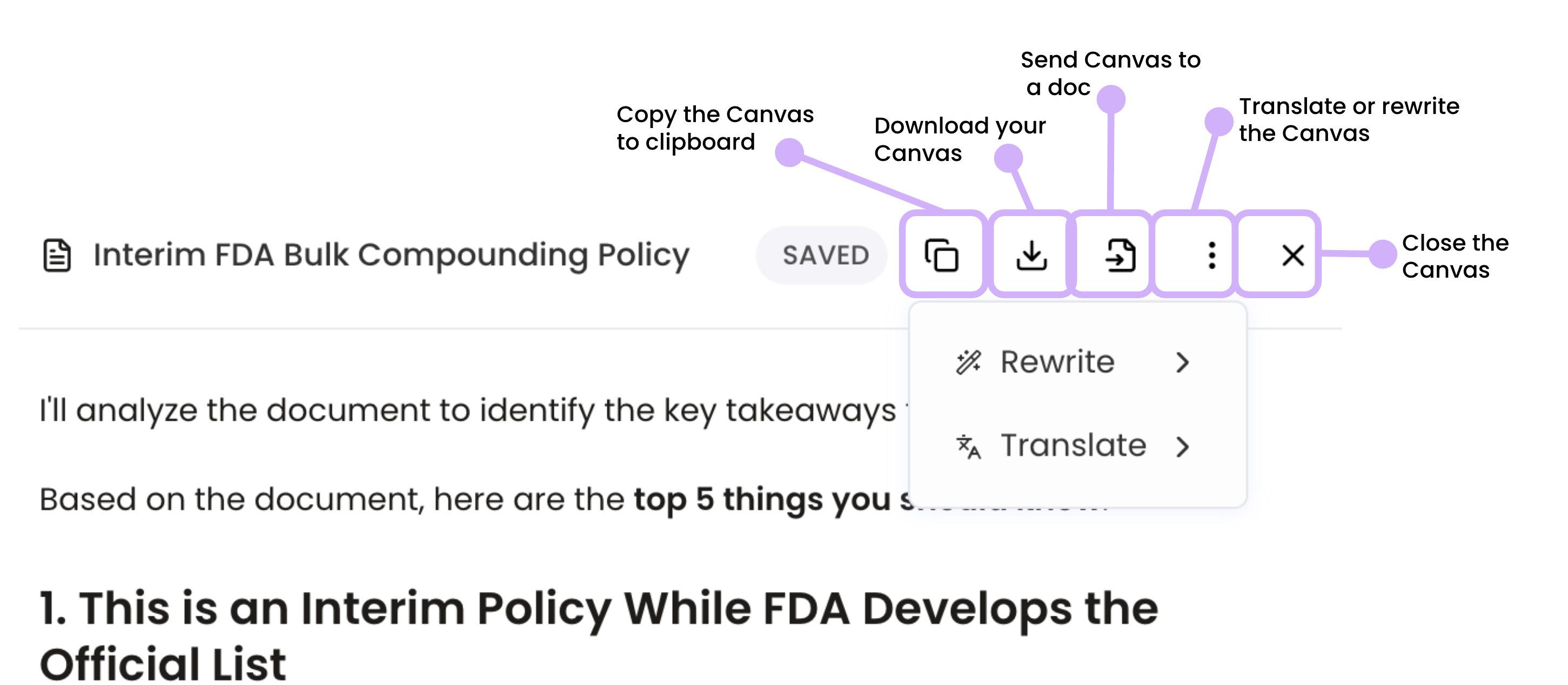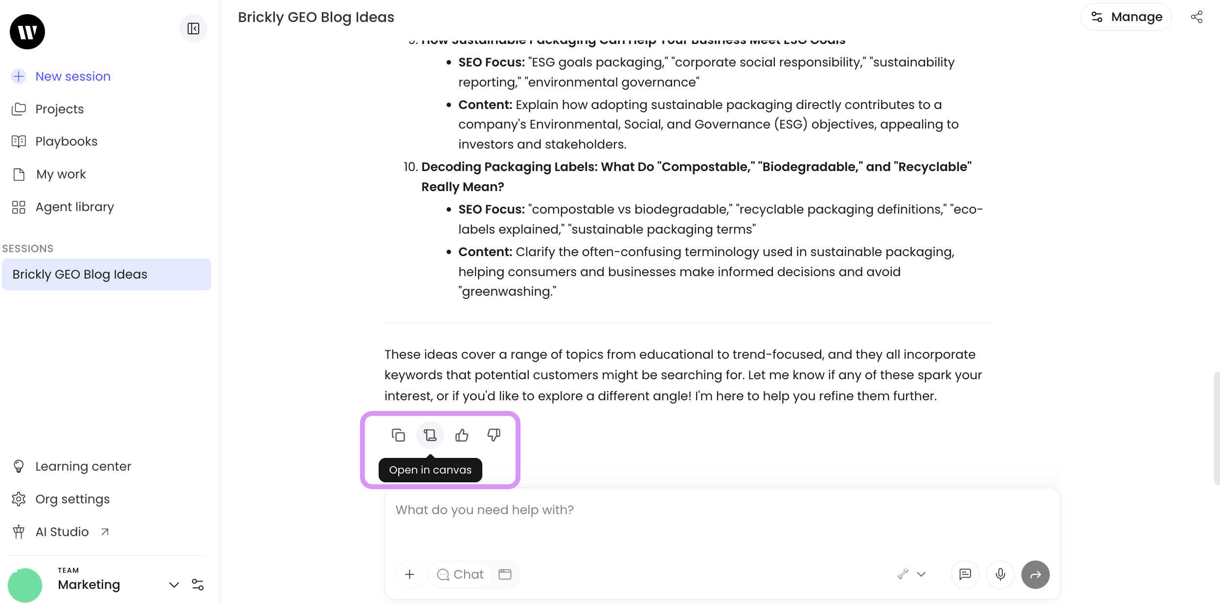 Select the Open in canvas icon to generate an interactive workspace for your output, with enhanced editing capabilities.