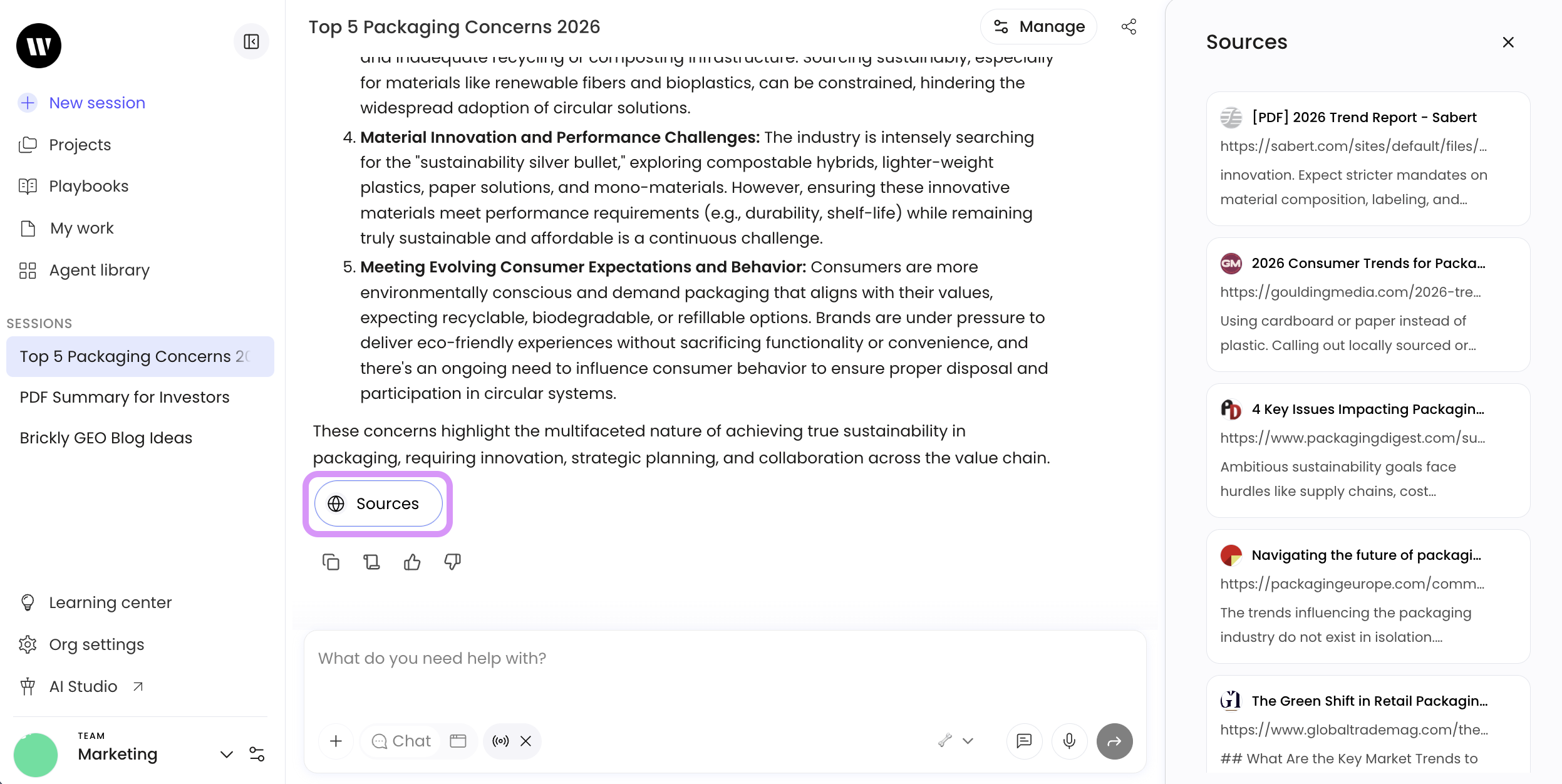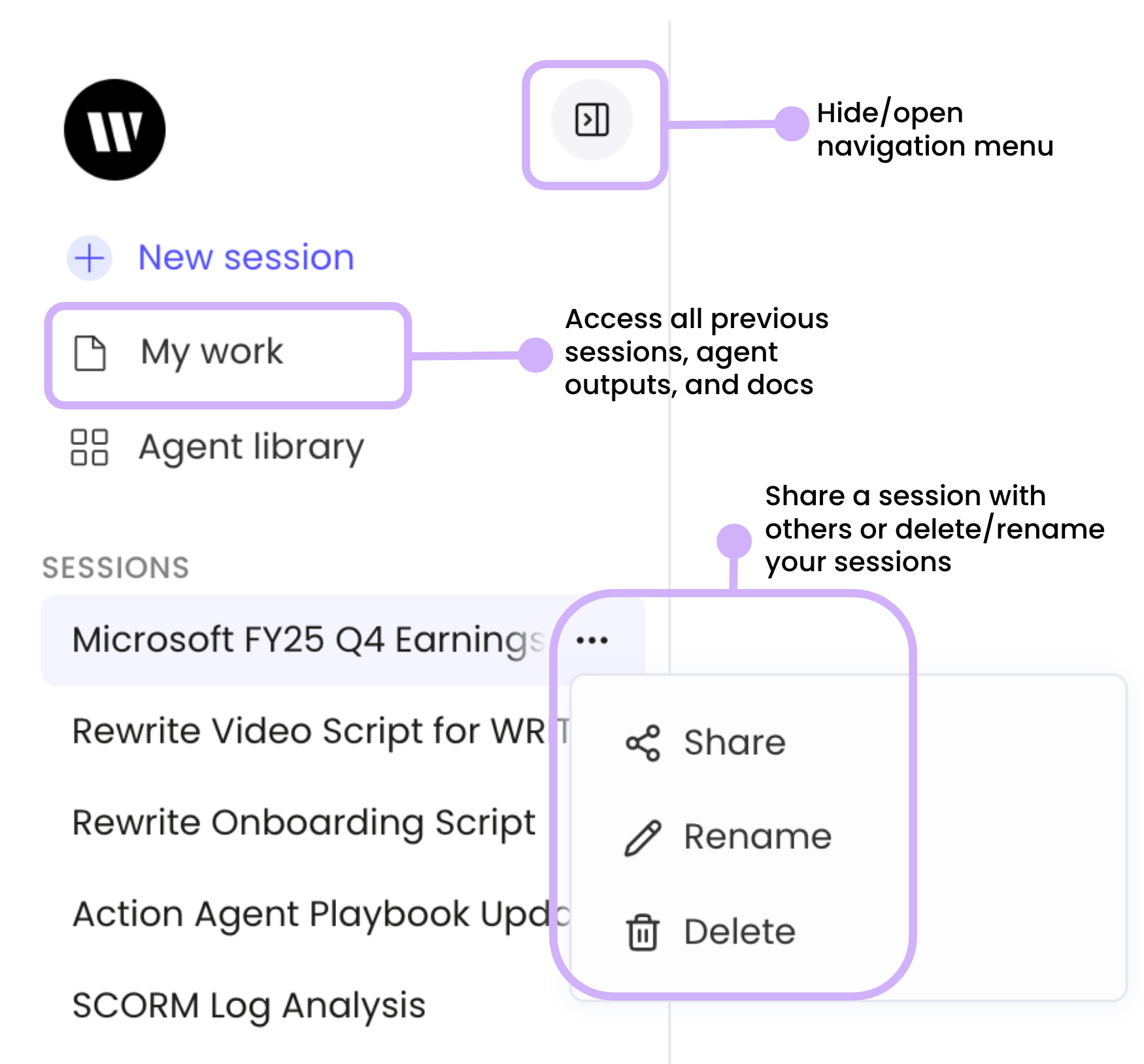 WRITER Agent turns each conversation into a session. You can access previous sessions and switch between them on the left side menu. You can select + New session to create a blank session. We recommend creating a new session whenever you start working on a new query – there's no limit to the number of sessions you can create!