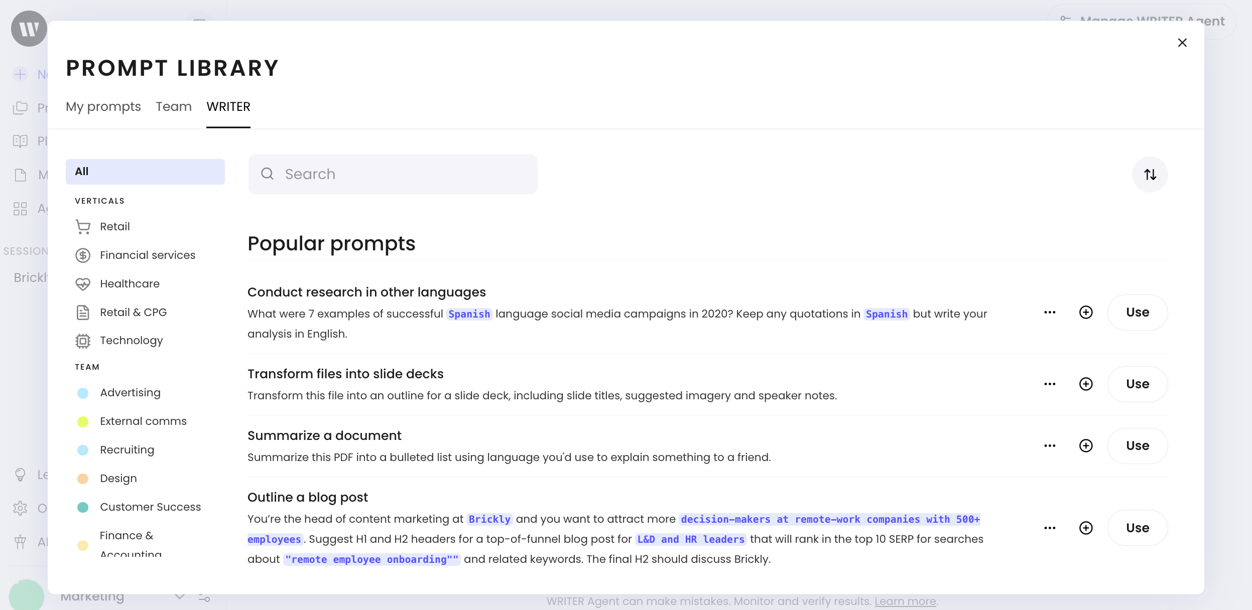 Select the View prompts button in the input field. Then, when you find a prompt you want to work with, select Use to insert it into WRITER Agent. Replace any variables with your own information, then submit. Learn more about the prompt library here.