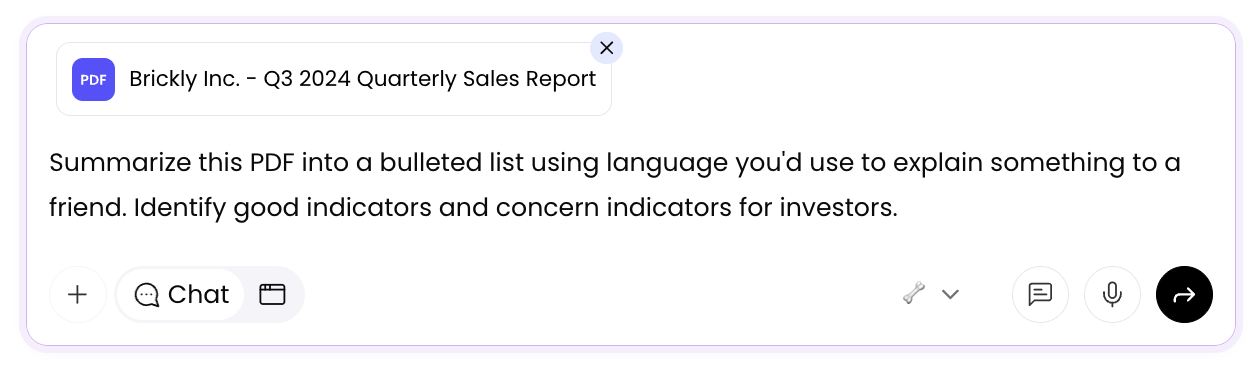 Example: Need to show your boss that you're on top of industry news? One company just published its quarterly earnings report, but you don't have time to read through the lengthy document. Download the earnings report as a PDF. In the input field, select the + and Upload from computer. Use the following prompt: