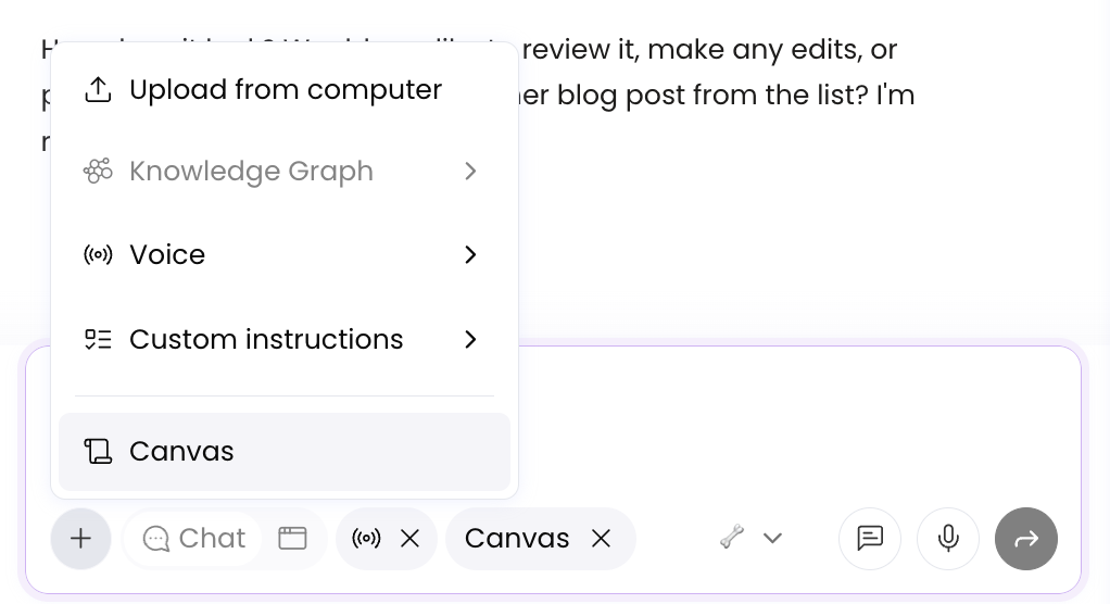 When making your request, select the canvas icon to create a workspace for your output. You can do this within an active chat mode session or by starting a new session and selecting the canvas option from the + menu. Once your output is sent to the canvas, you'll be able to make endless updates and iterations until it's perfect.