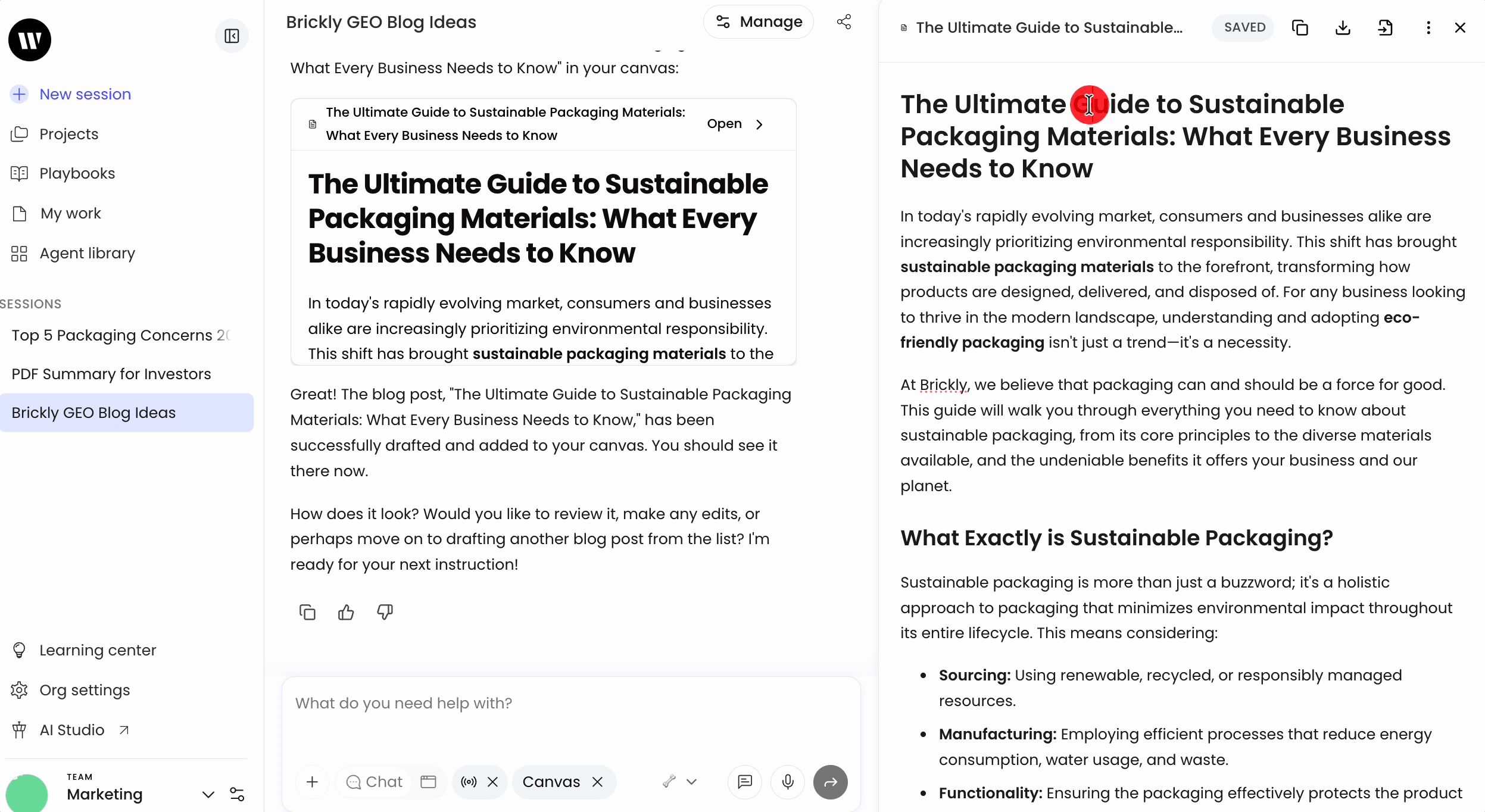 If you've enabled the canvas option, you'll see a preview of the generated output in the left window. You can continue to chat back and forth with WRITER Agent on the left, or make edits directly in the canvas.
